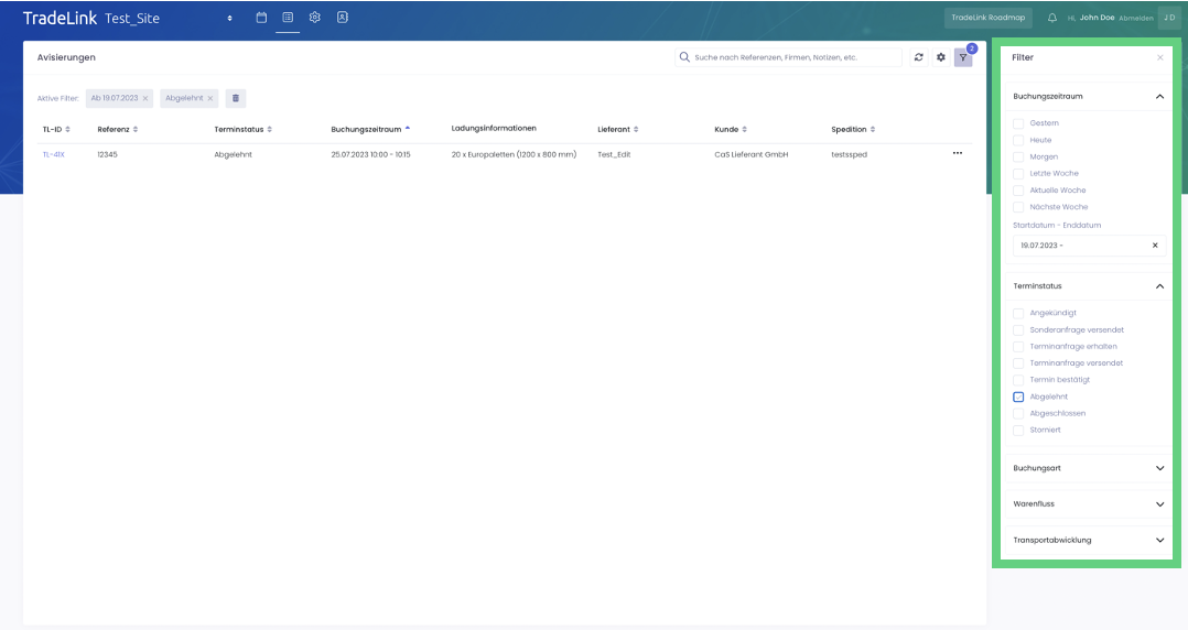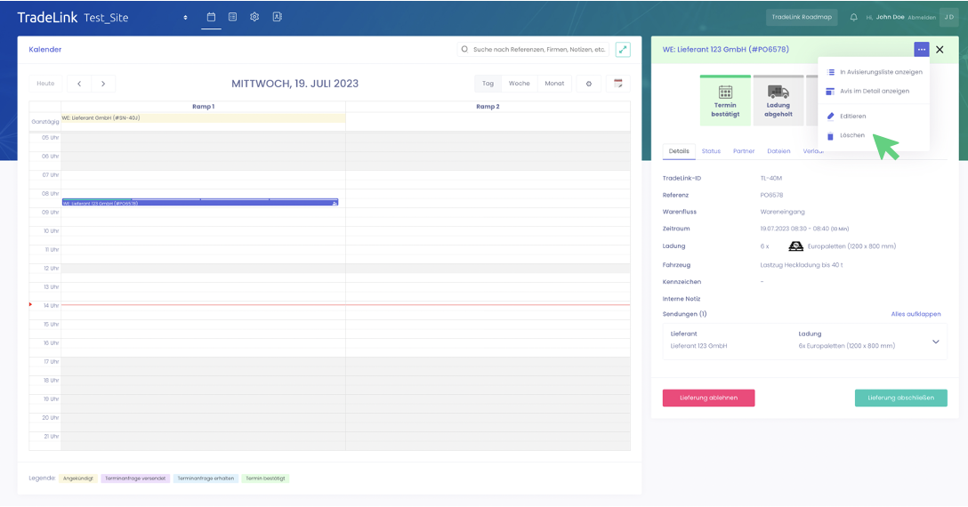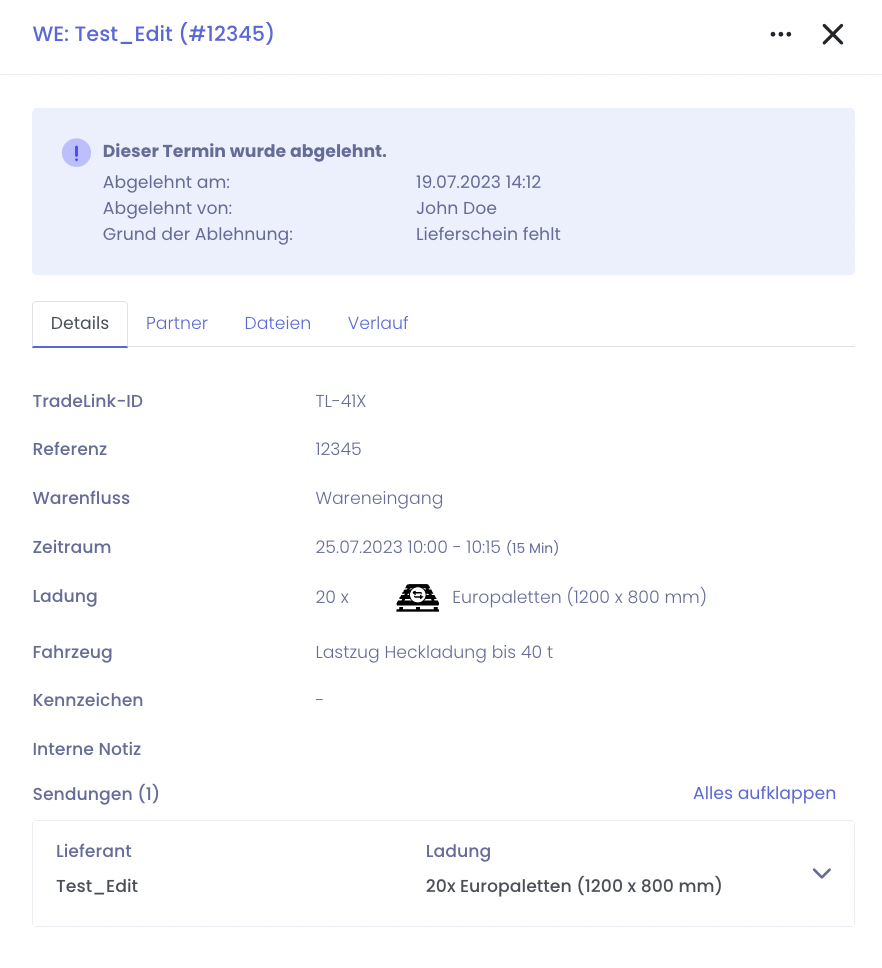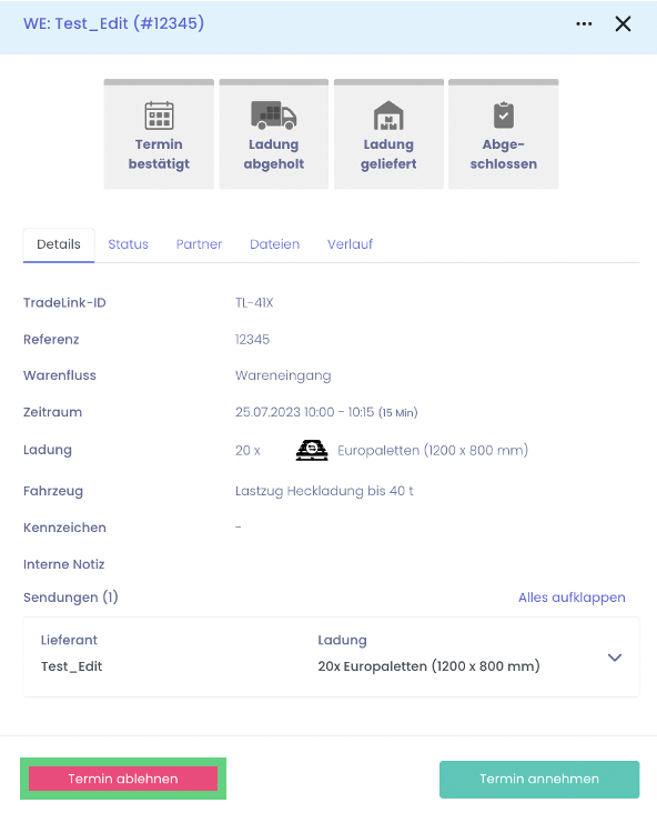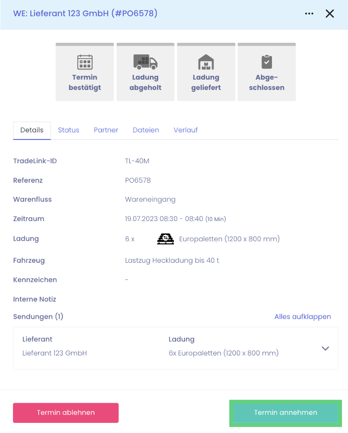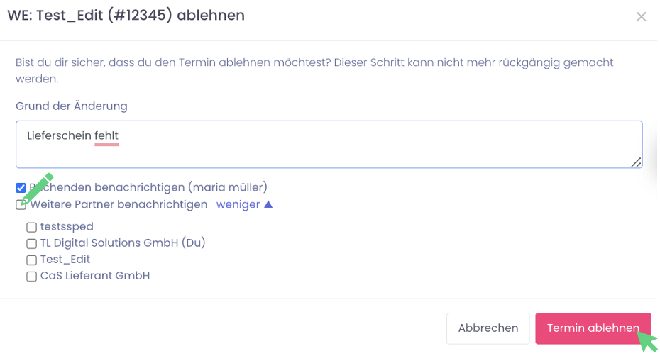 Falls die angegebenen Informationen falsch oder unvollständig sind (z.B. Lieferschein fehlt), kannst du den Termin ablehnen.