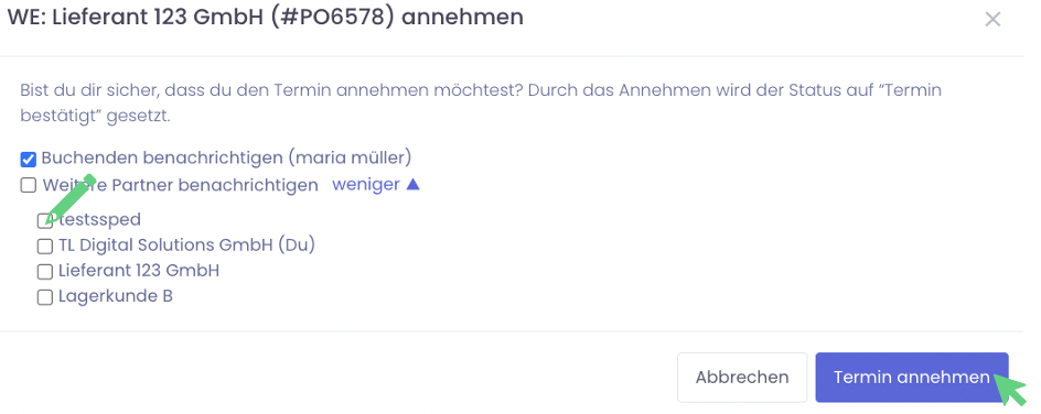 Wenn du den Termin annimmst, kannst du außerdem wählen, ob nur die Buchende Person, oder auch weitere an diesem Transport beteiligten Parteien darüber benachrichtigt werden sollen.