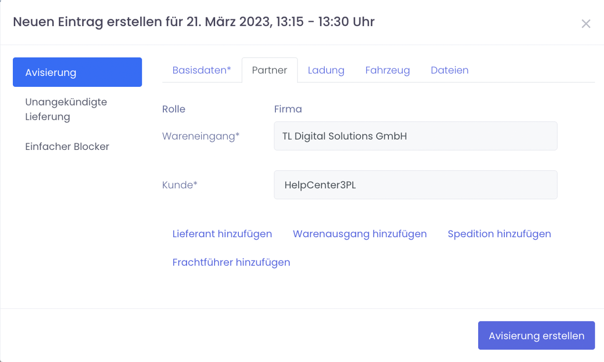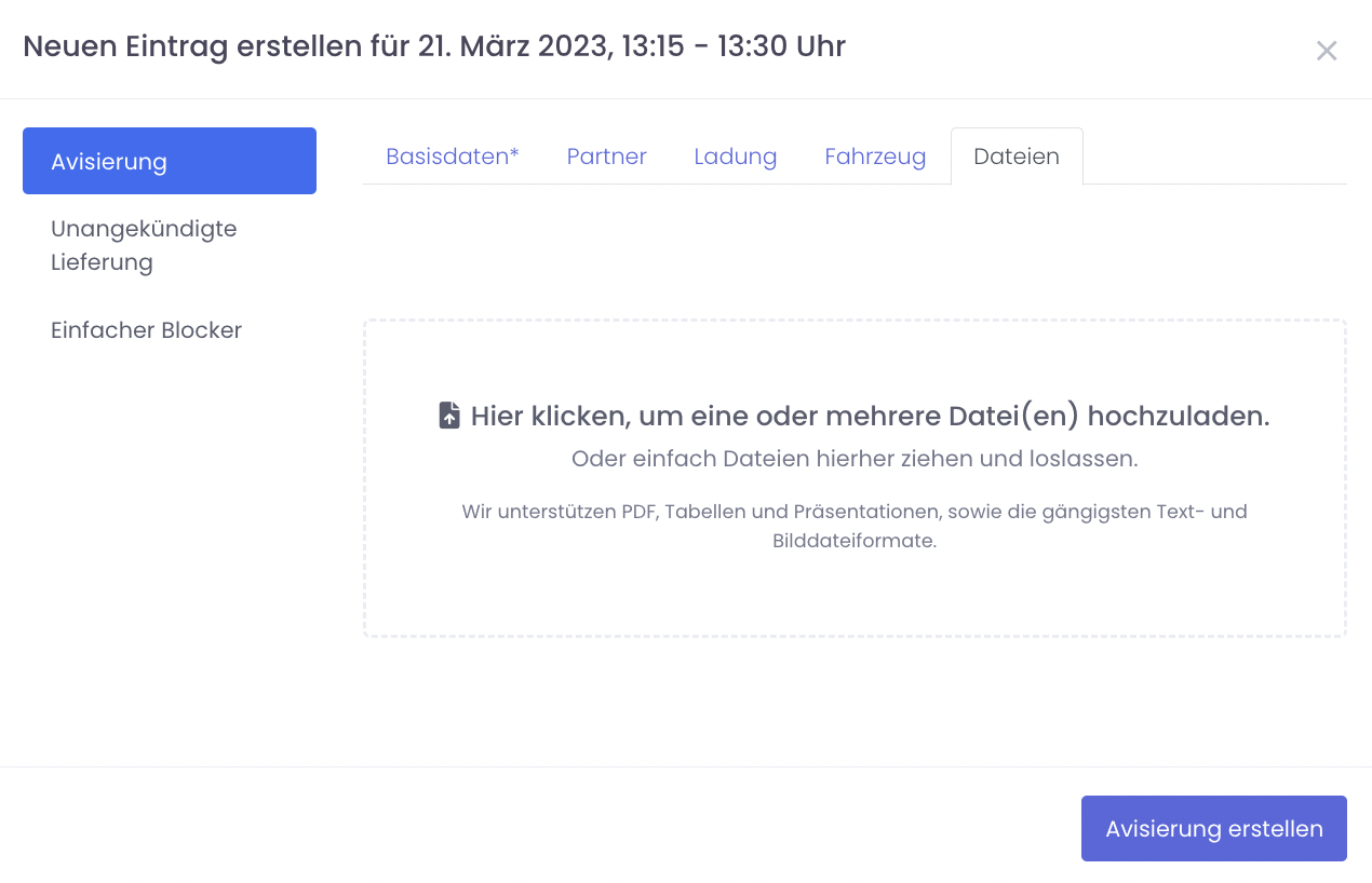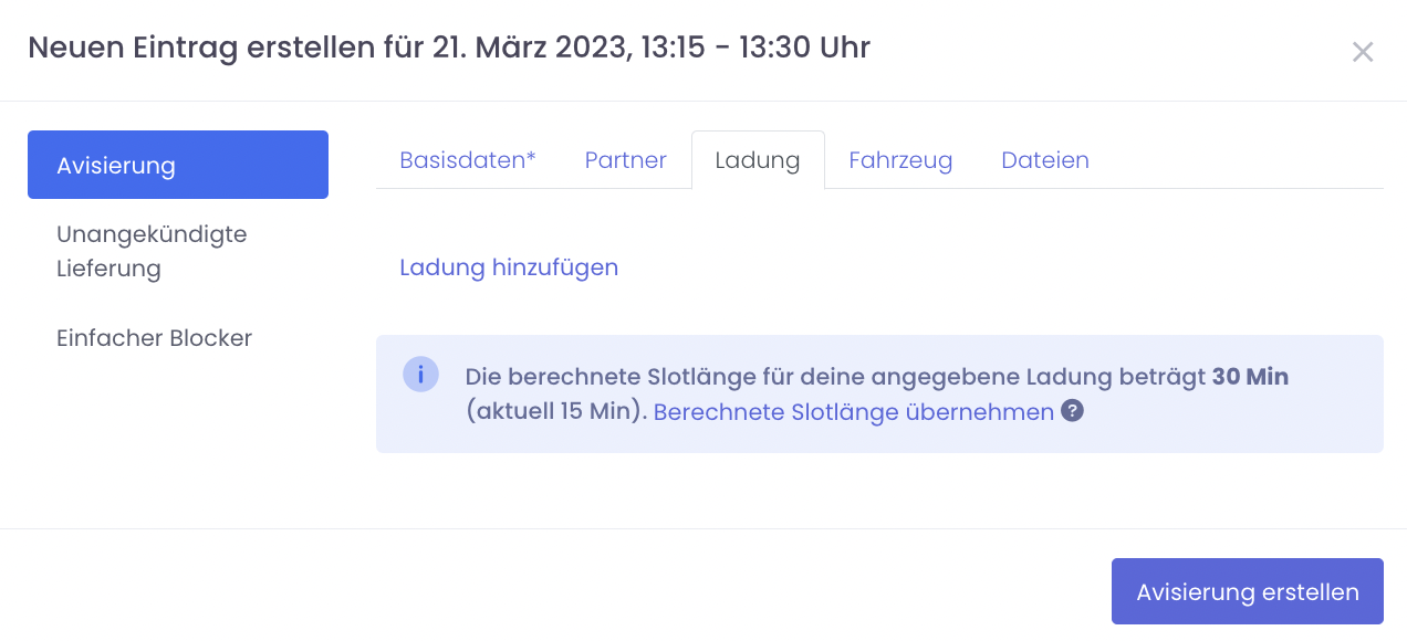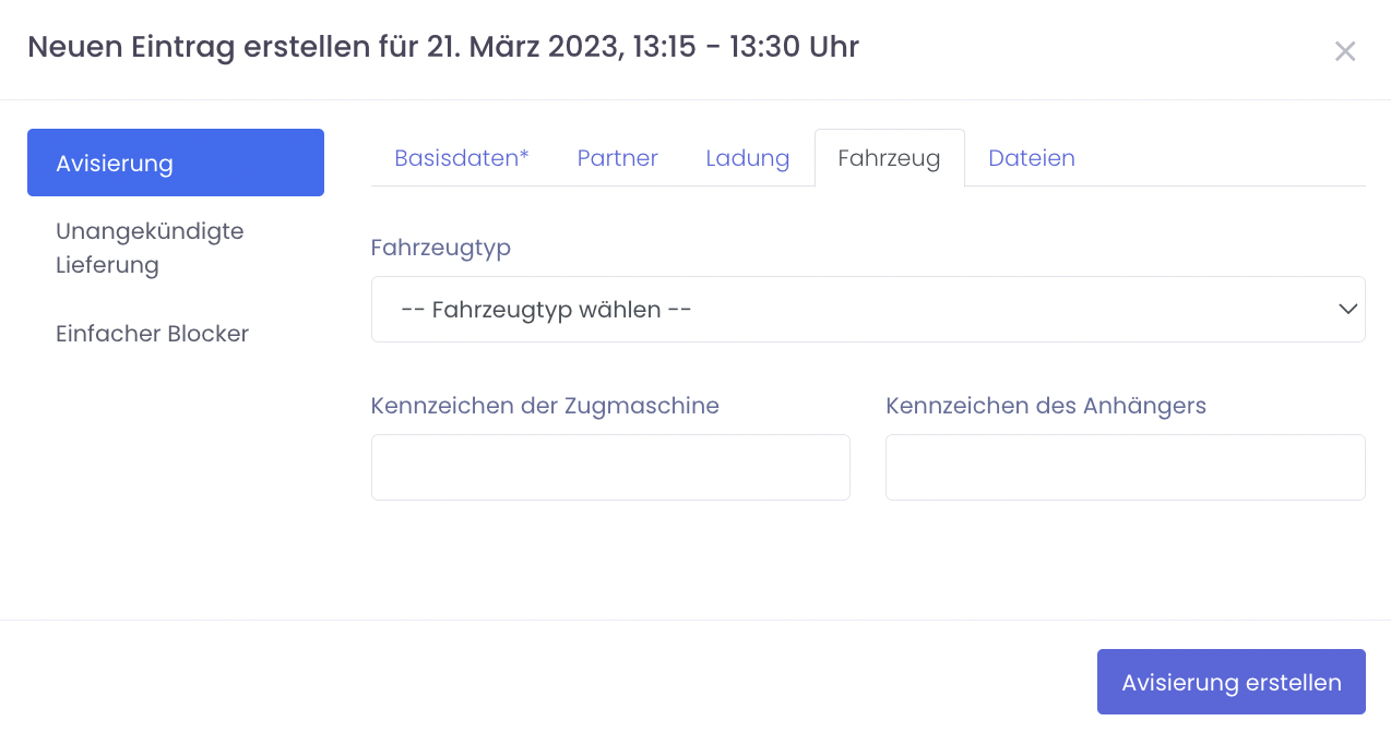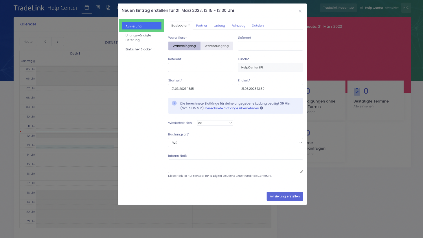 Wenn du alle Daten eingegeben hast, kannst du auf 'Avisierung erstellen' klicken, um deine Buchung abzuschließen und zu erstellen. Diese wird dann im Kalender für den von dir angegebenen Zeitraum erscheinen.
