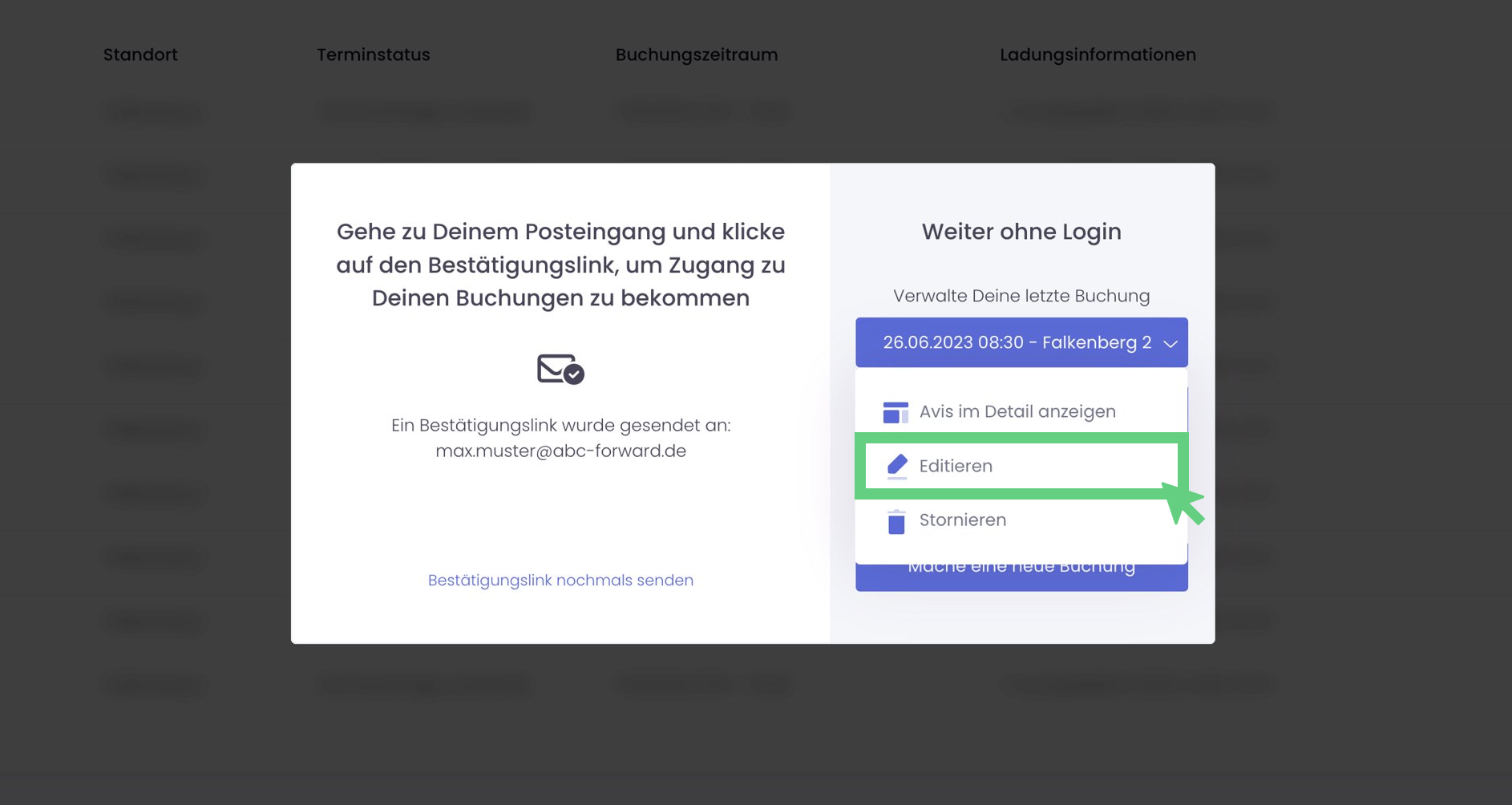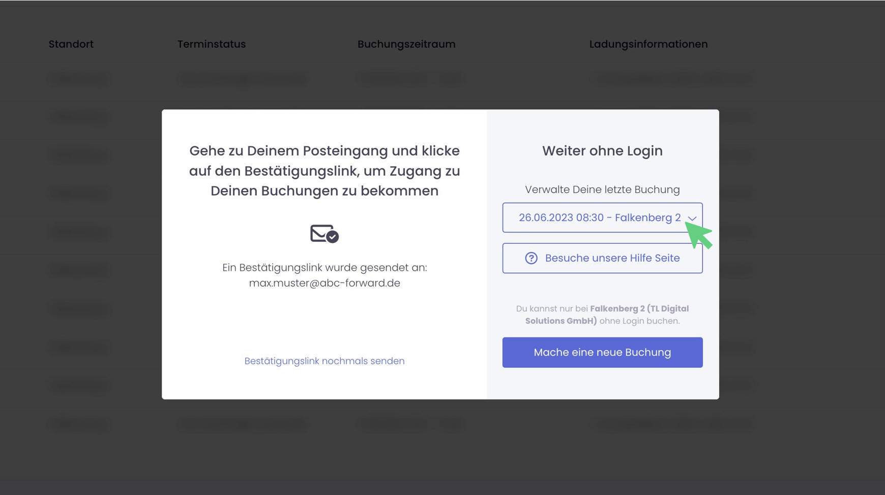 Sobald du das Buchungsformular ausgefüllt hast und die Avisierung abgeschlossen hast, erscheint ein Fenster, welches die letzte Buchung zeigt. Unter "Verwalte deine letzte Buchung" findest du das Datum und den Standort der soeben getätigten Avisierung.