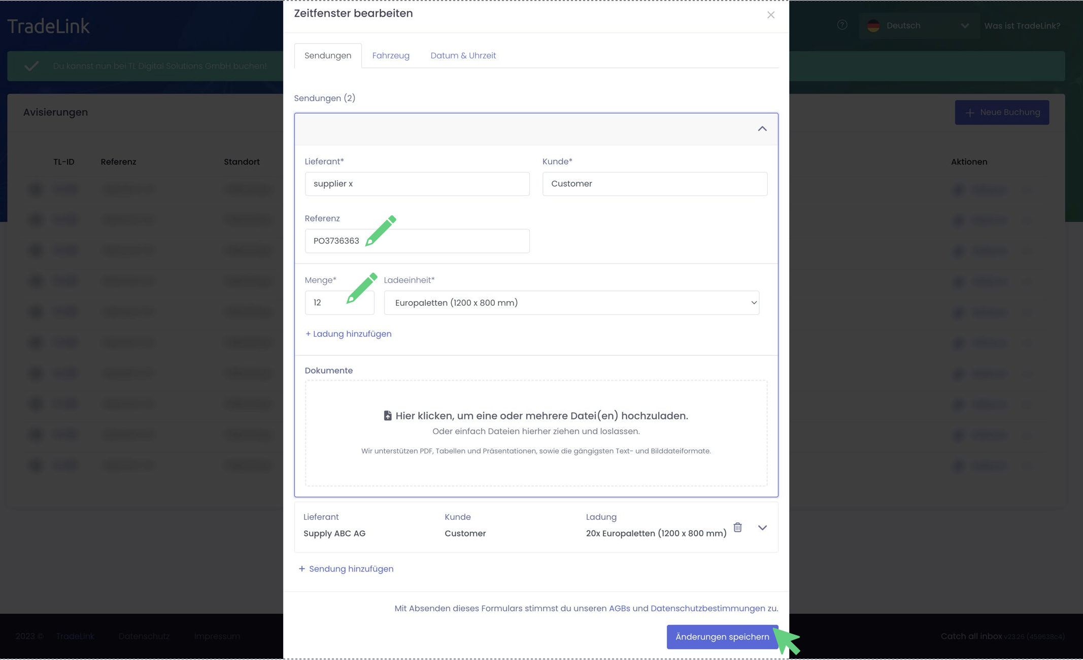 Wenn du eine Sendung zum Bearbeiten ausgewählt hast, kannst du dort bspw. den Lieferanten austauschen, die Referenz oder Ladungsmenge anpassen und fehlende Dokumente ergänzen. Klick anschließend auf "Änderungen speichern", um die Anpassungen abzuschließen.