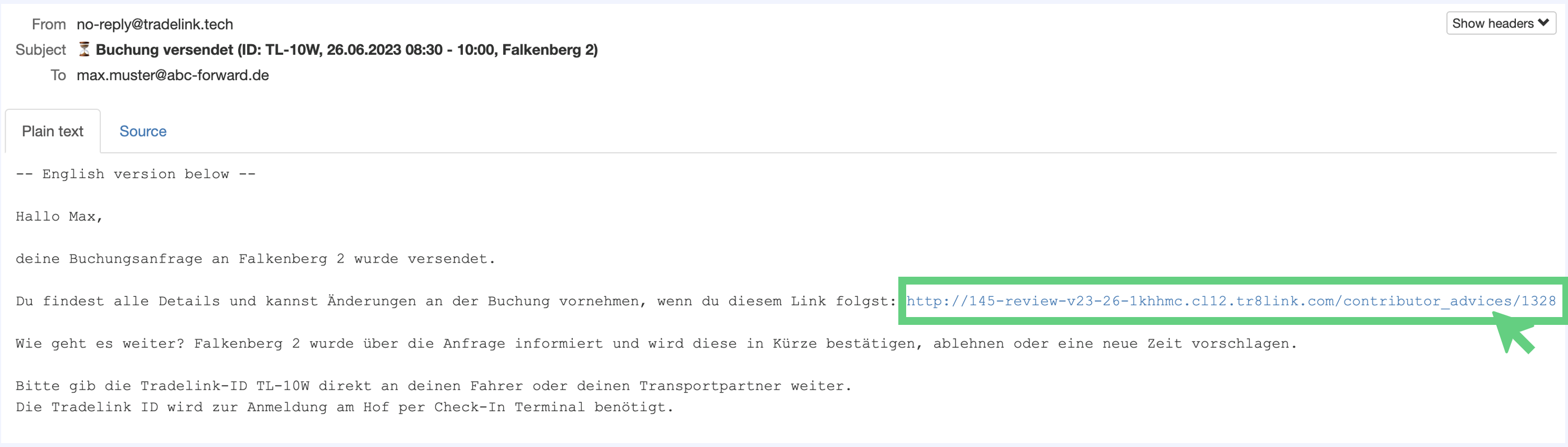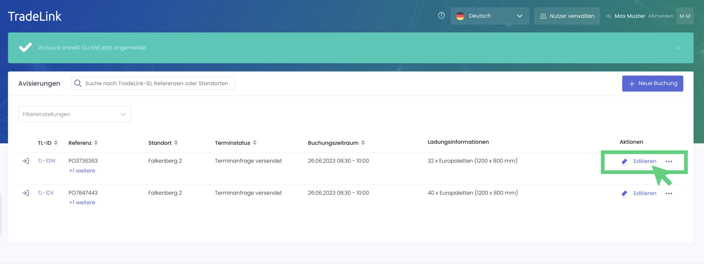 Wenn du ein TradeLink Konto erstellt hast, kannst du schnell und einfach alle Avisierungen inklusive Sendungen bearbeiten und verwalten. Dafür loggst du dich mit deinen Nutzerdaten zu deinem Konto ein und rufst die letzte Buchung auf. Diese kannst du auch über das Suchfeld finden oder, wie in Variante 2 erklärt, über deine Emails aufrufen.