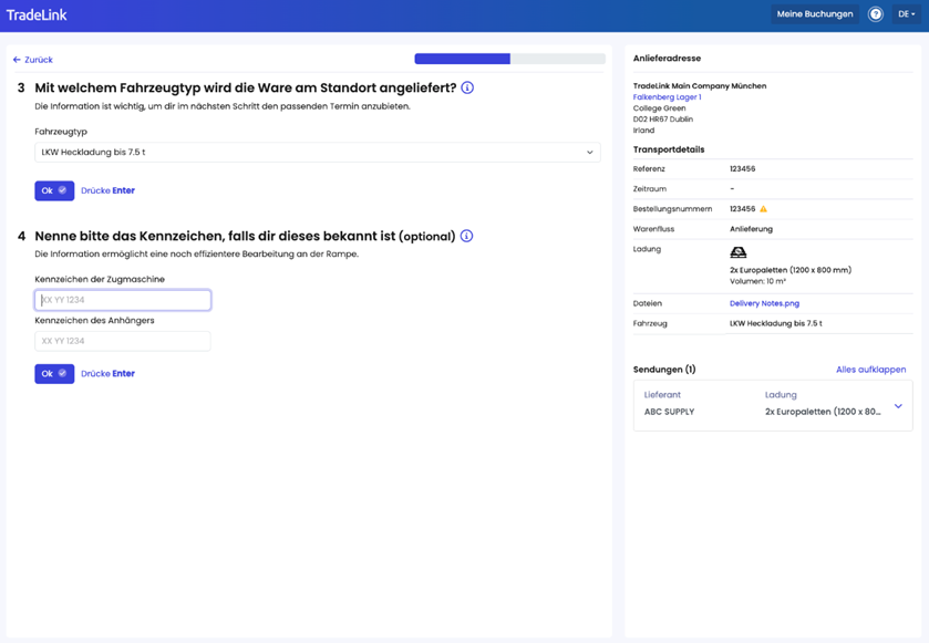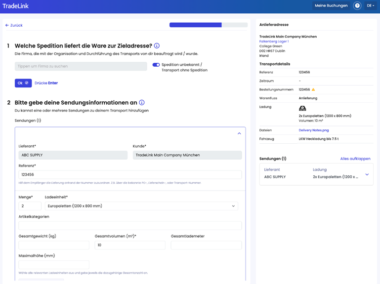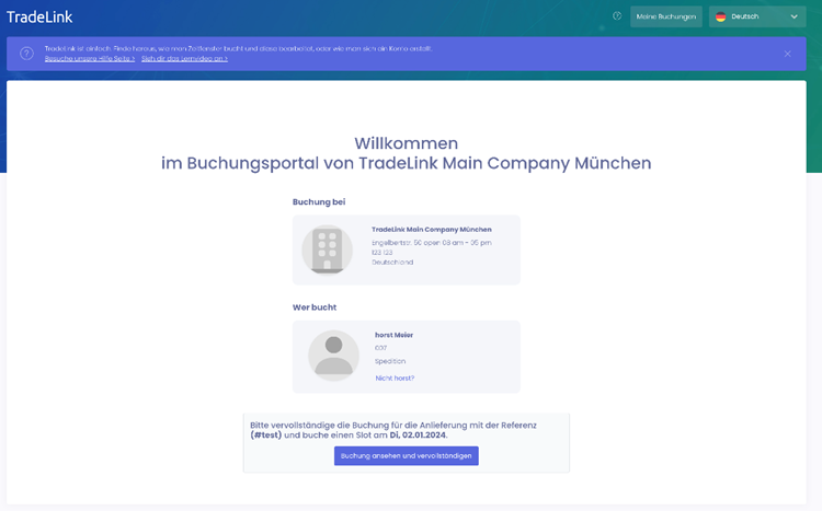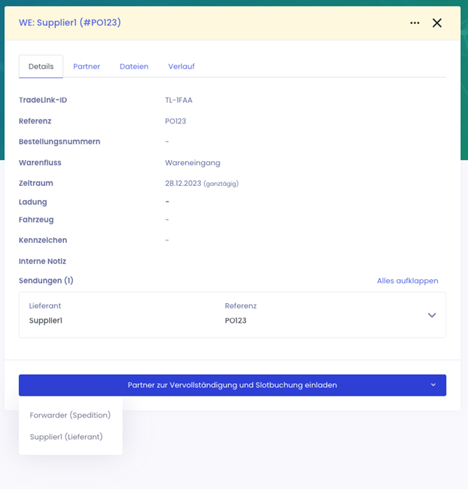 Einladung zur Buchungsvervollständigung: Nutze den neuen Button „Partner zur Vervollständigung und Slotbuchung einladen“, um deinen Lieferpartner zur Buchungsvervollständigung einzuladen.