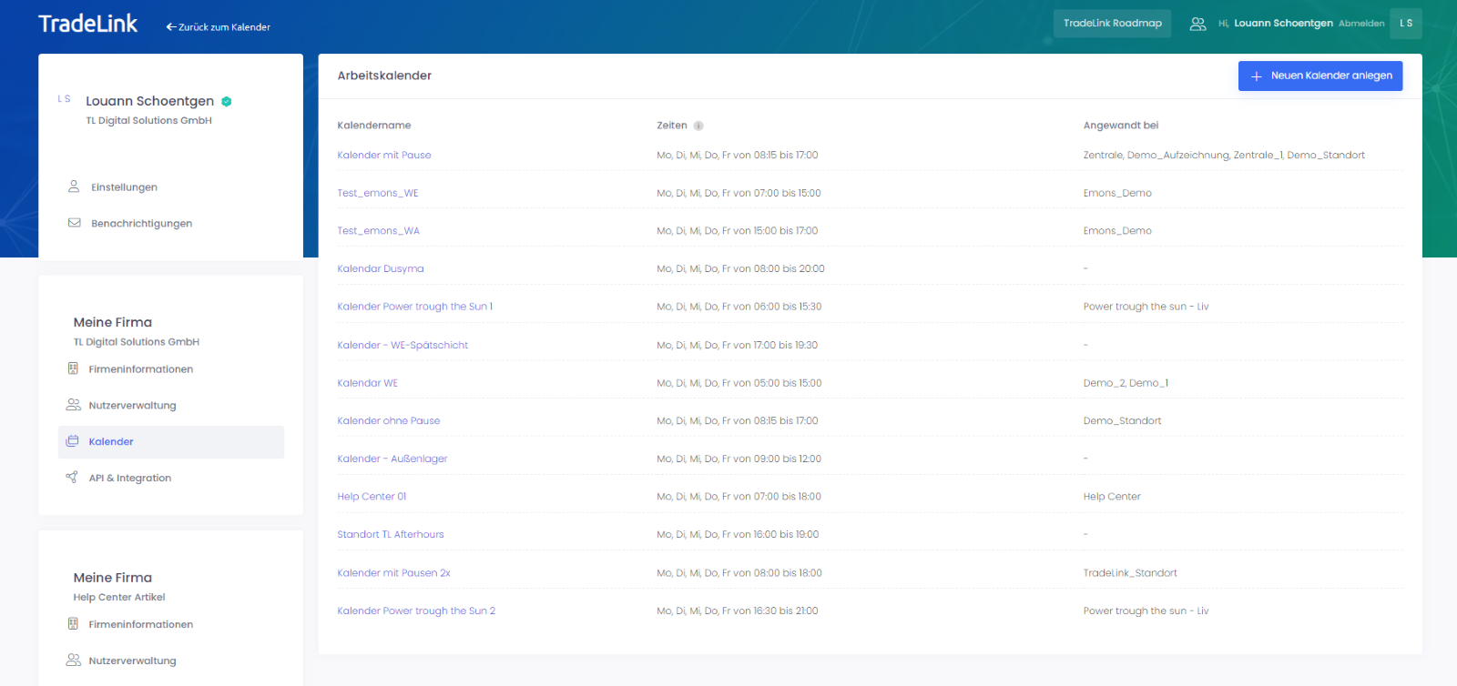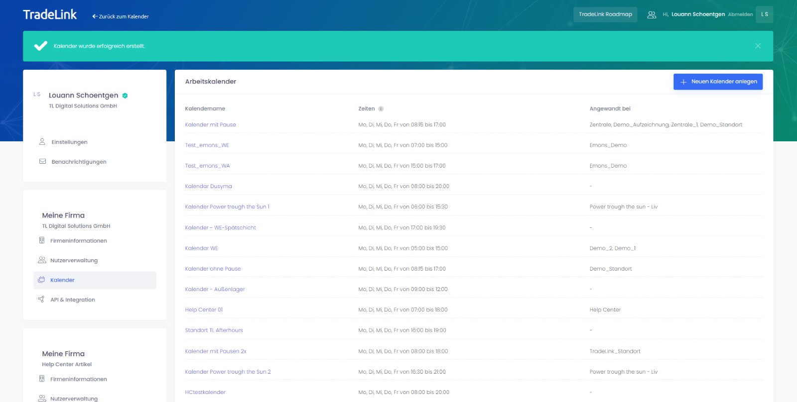 Speicher deine Einträge, indem du auf 'Kalender erstellen' klickst. Dein Kalender erscheint dann unter 'Arbeitskalender' und kann nun deinen Ladestellen entsprechend zugewiesen werden.