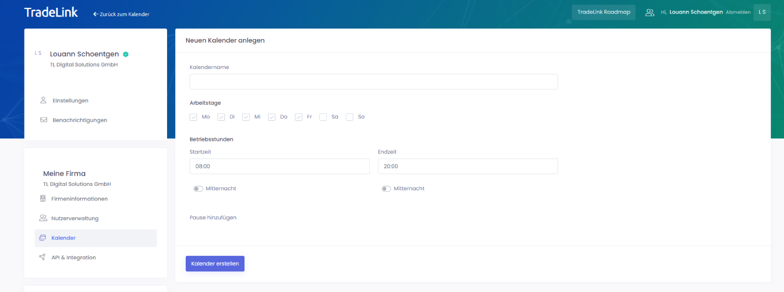Im ersten Schritt kannst du deinen Kalender benennen (z.B. Kalender WE). Außerdem kannst du die Arbeitstage und Betriebszeiten festlegen.