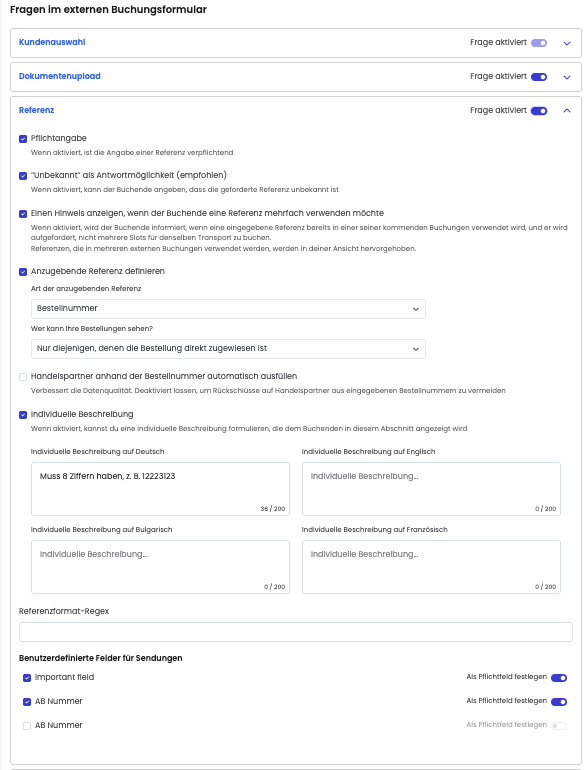 Wenn die angegebene Referenz einem bestimmten Format entsprechen soll, kannst du dieses im Referenzformat-Regex festlegen (z.B. 8 Ziffern)