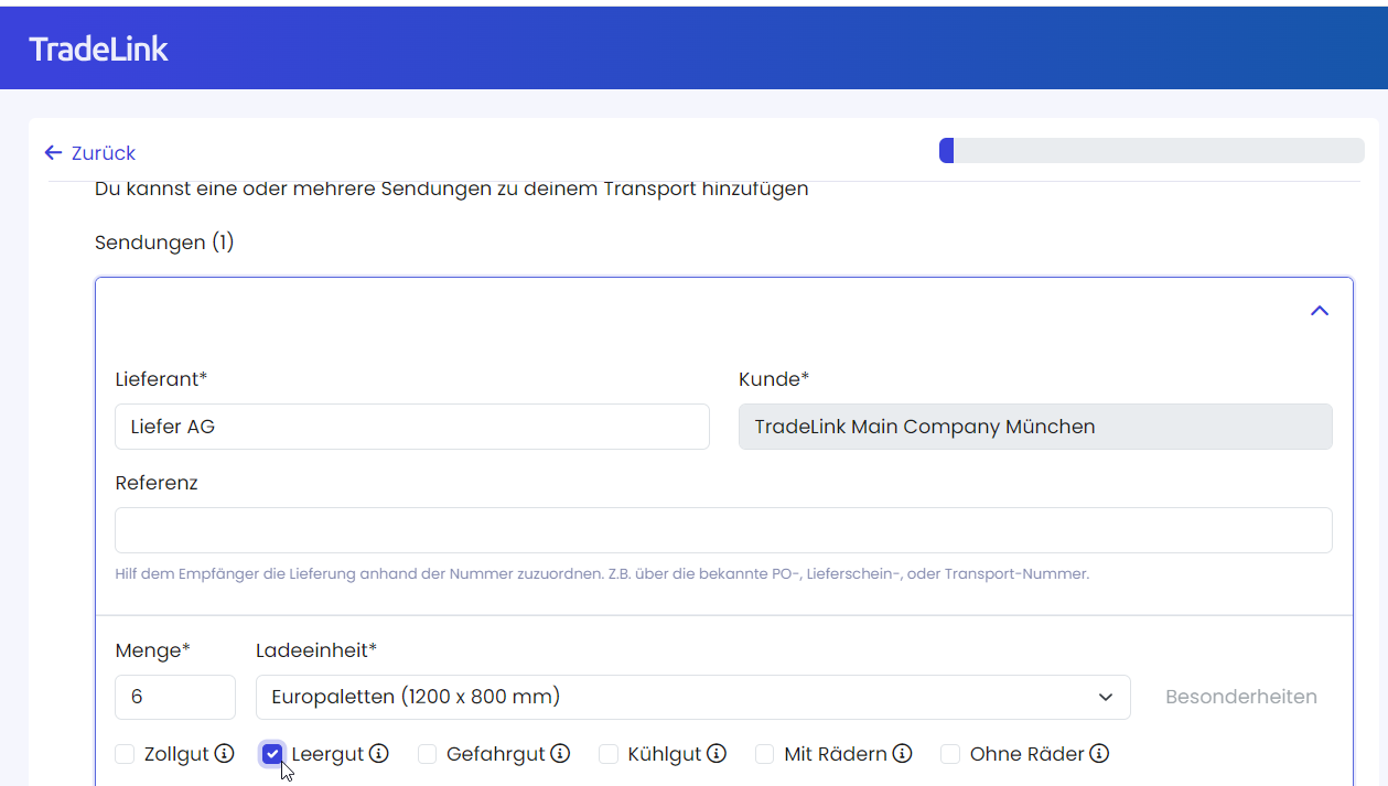 Nach wie vor kannst du in der bekannten Buchungsmaske die Anzahl des "Leerguts" dediziert per Kontrollkästchen kennzeichnen (füge eine extra Ladeeinheit für die Anzahl der leeren Ladungsträger ein).