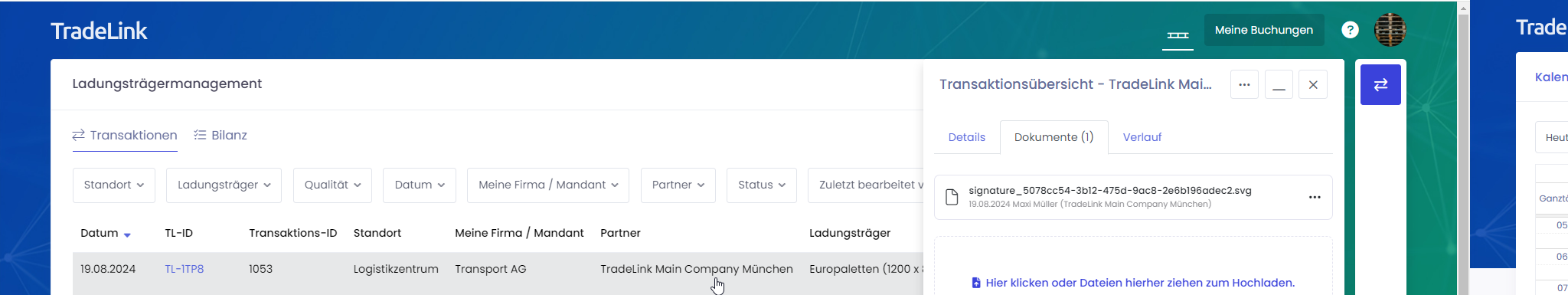 Klicke in der "Transaktionsansicht" auf die jeweilige Transaktion und prüfe den Reiter "Dokumente" auf Unterschriftsdateien: