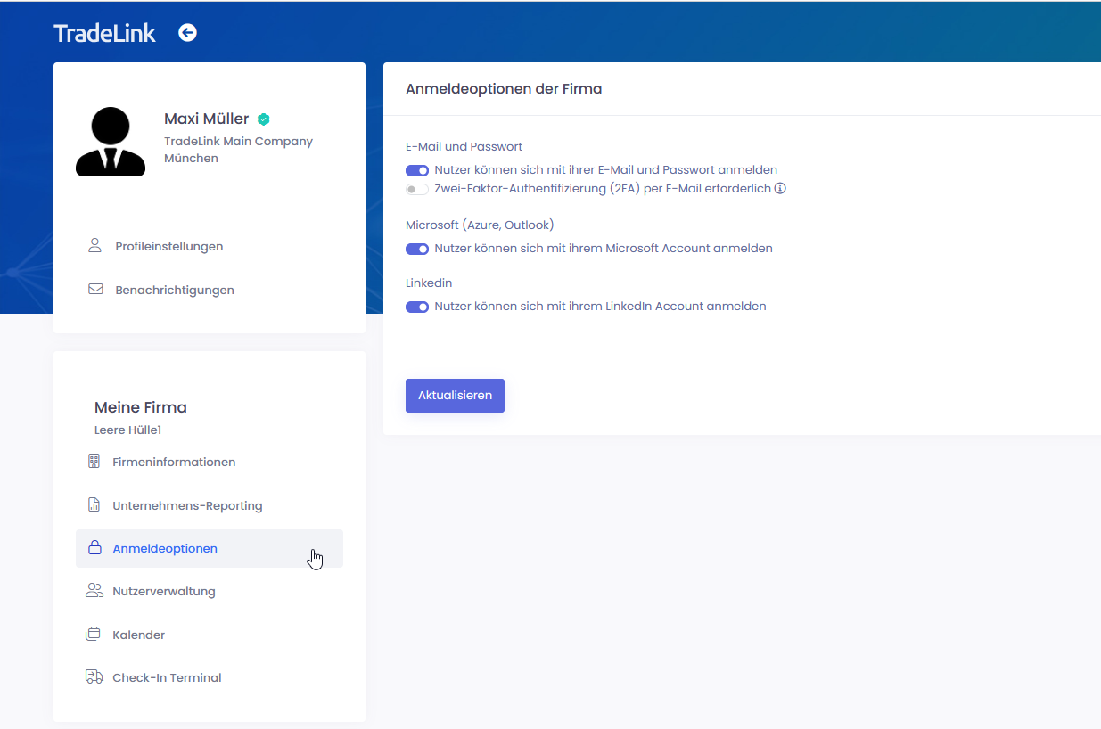 Falls SSO aktiviert ist, ist dies die Standardmethode für die Anmeldung. Sollte der Zugang über SSO aus irgendeinem Grund nicht möglich sein, wende dich an deinen TradeLink-Administrator.