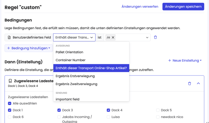 Du kannst alle benutzerdefinierten Felder auf Avis- und Sendungsebene auch in den Transportregeln als Bedingung hinzufügen.