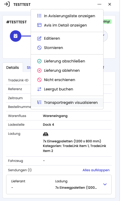 Wenn du im Detail nachvollziehen möchten, welche Regeln auf ein bestimmtes Avis angewendet wurden und warum, gehe in den Kalender, klick auf ein Avis und öffne über das Drei-Punkte-Menü die Option „Transportkonfiguration visualisieren“.