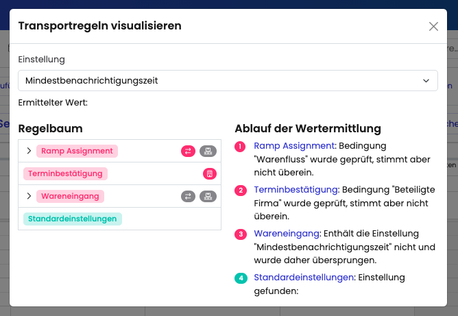 Ergebnis: Wird ein Outbound-Transport mit Kühlware gebucht, wird Dock 2 zugewiesen und die Mindestvorlaufzeit beträgt 3 Werktage statt der 24 Stunden aus den Standardeinstellungen.