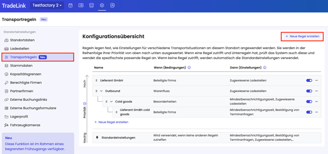 Für jeden Transport prüft TradeLink alle Regeln von höchster zu niedriger Priorität und wendet für jede Einstellung die erste passende Regel an.