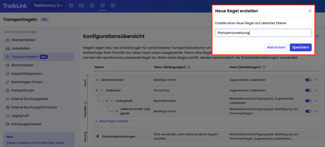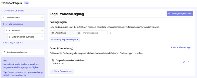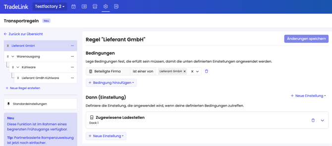 2. Erstelle eine Regel und wähle „Dock 1“ als zugewiesene Ladestelle für „Beteiligte Firma = Lieferant GmbH“.