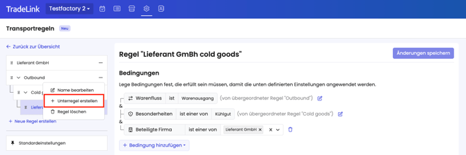 Erneut gilt: Unterregeln werden vor Regeln auf oberster Ebene geprüft. Wenn eine Unterregel auf einen Transport zutrifft, hat sie Vorrang vor der Regel. Wenn nicht, wird die Regel auf oberster Ebene angewendet.