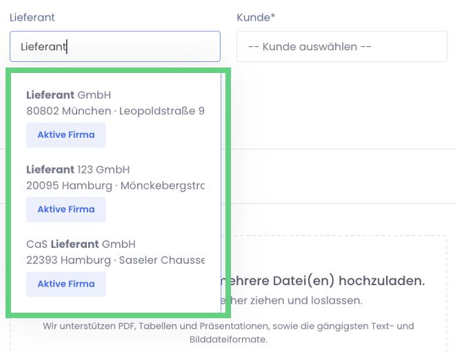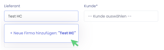 Wenn die von dir angegebene Partnerfirma noch nicht zu TradeLink eingeladen wurde, erscheint die Option "+ Neue Firma hinzufügen". Dadurch wird eine "Hülle" ohne einen echten Nutzer erstellt.