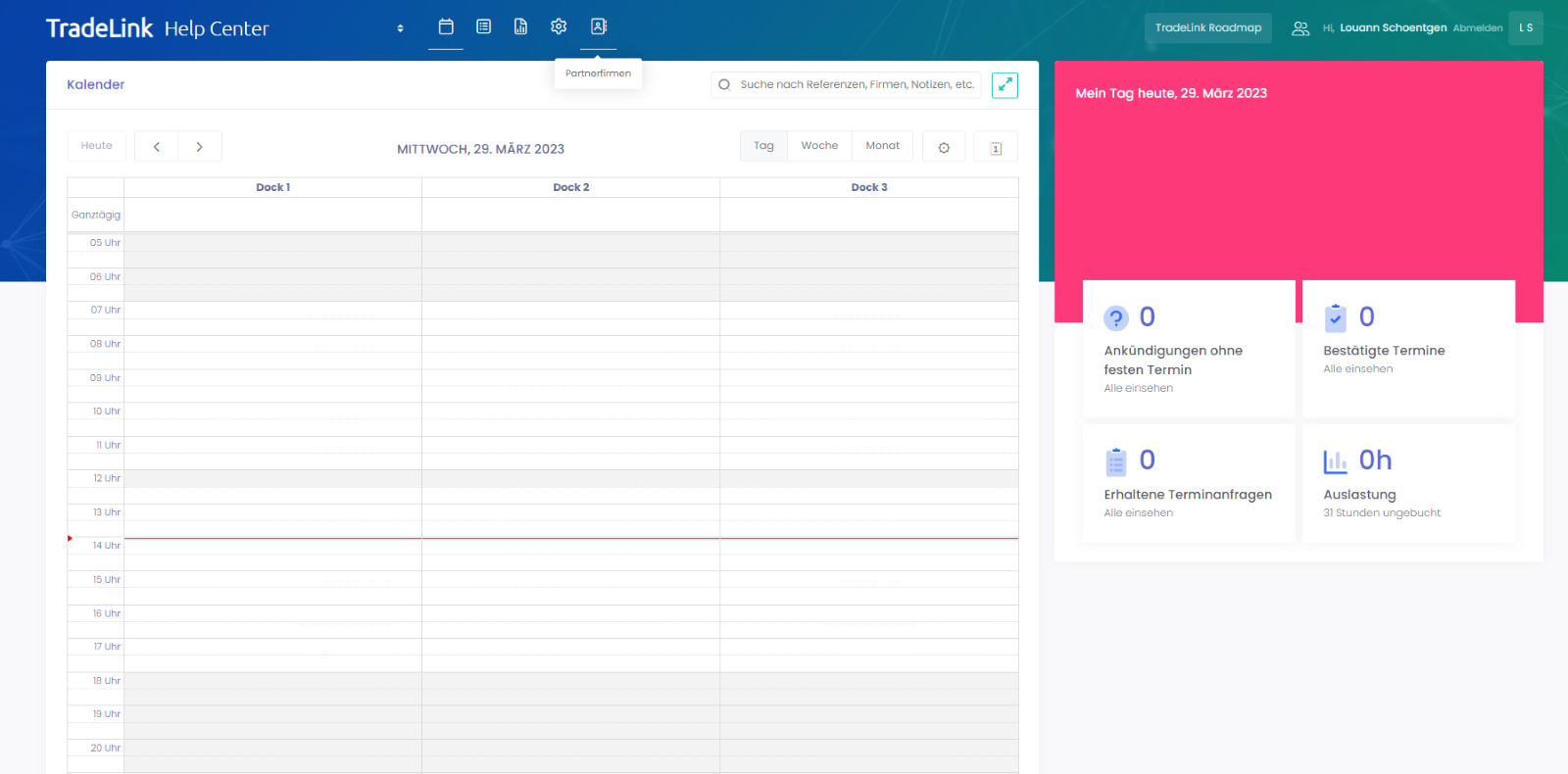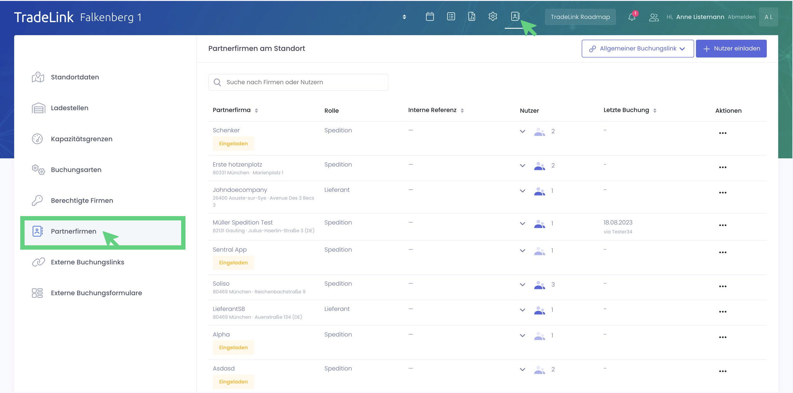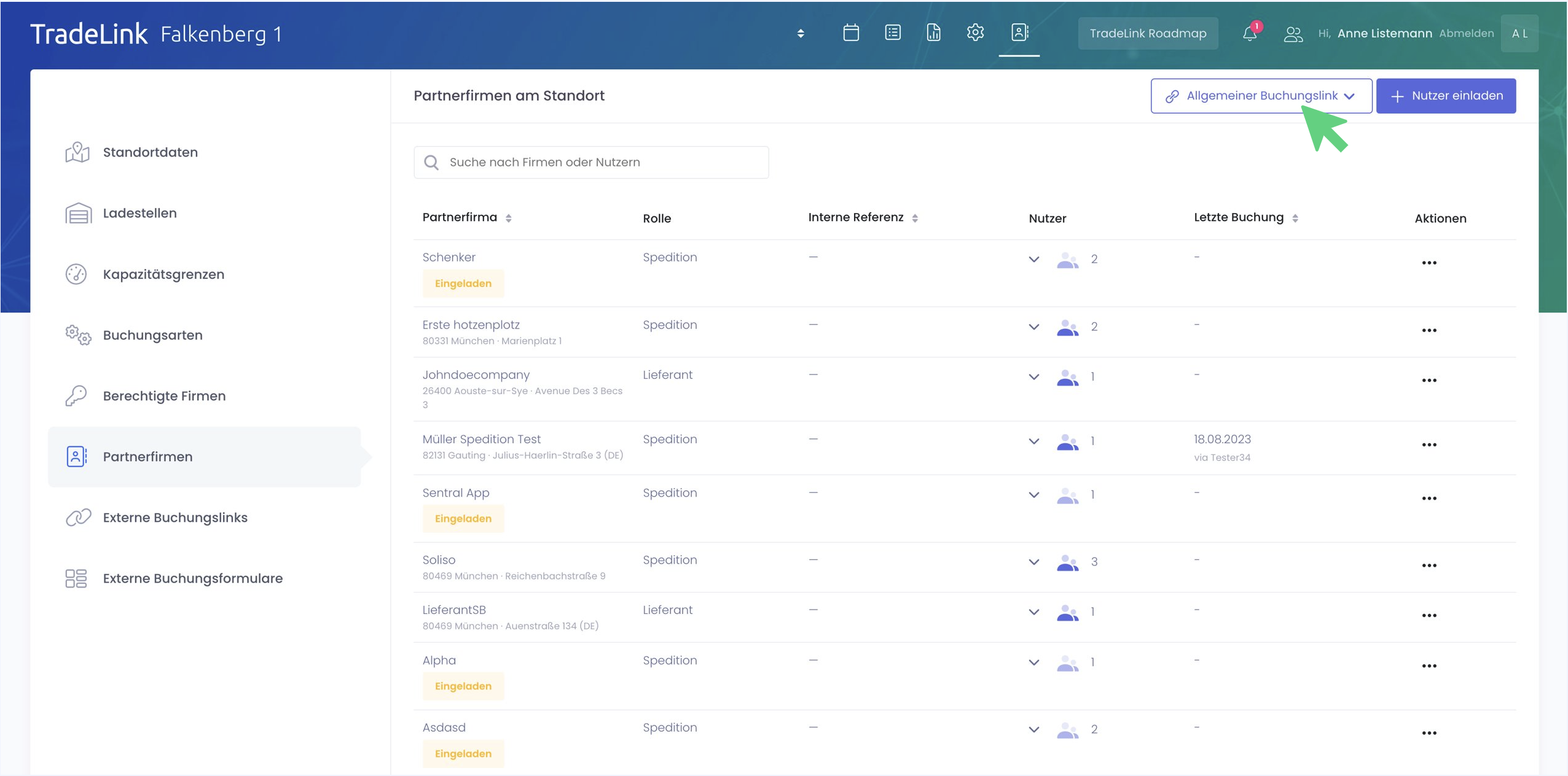 Eine weitere Variante, Partnerfirmen schnell und einfach zum Avisieren einzuladen, ist der allgemeine Buchungslink. Auch hier gelangst du wie oben beschrieben über die Menüleiste zu den Partnerfirmen.