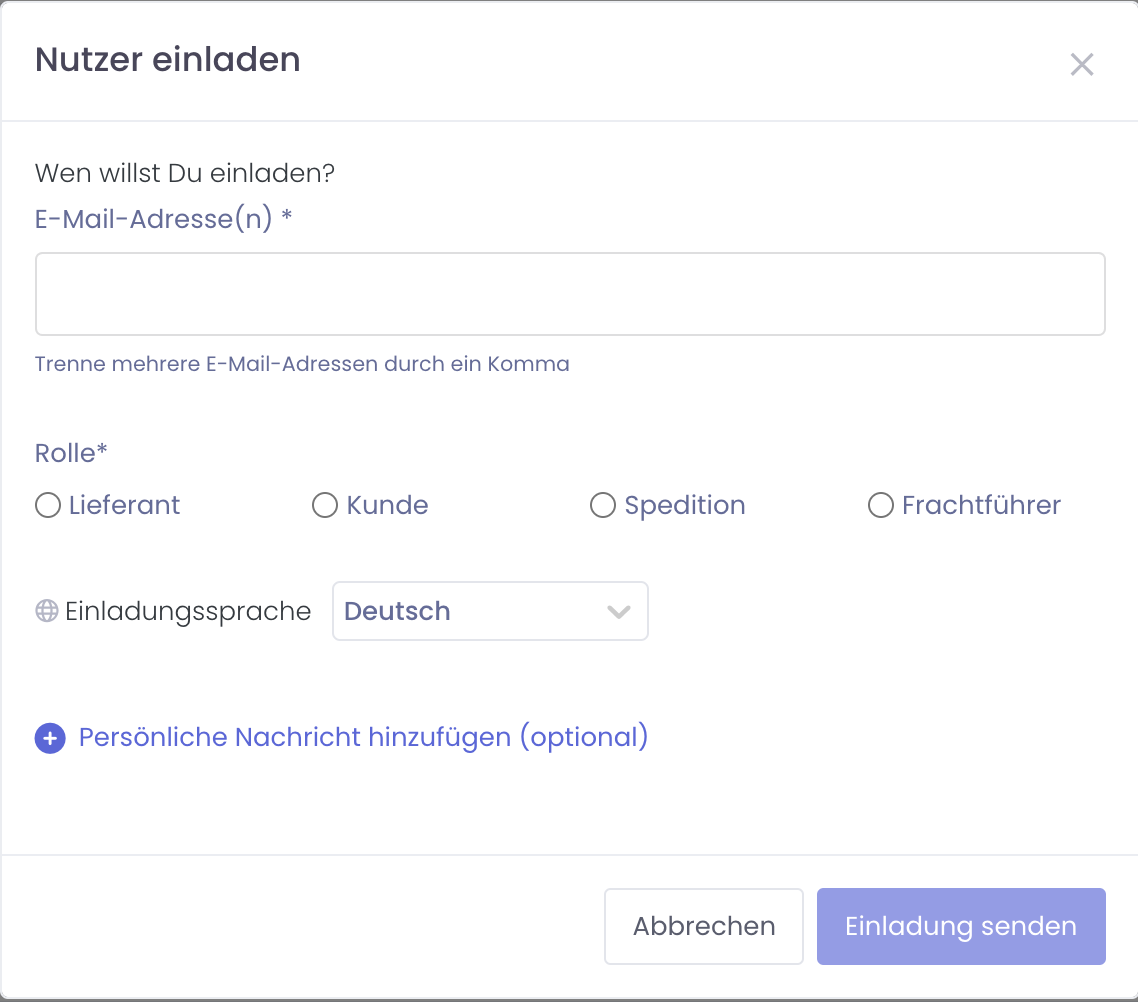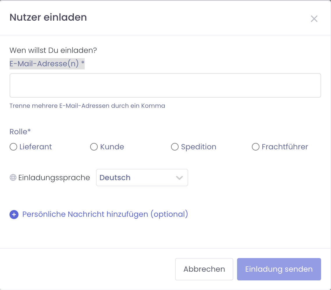 Anschließend gibst du die E-Mail-Adresse(n) deiner Partner in dem Einladungsformular an. Du kannst auch mehrere Partner auf einmal einladen, indem du einfach alle E-Mail-Adressen in das Feld "E-Mail-Adresse(n)" reinkopierst. Wichtig ist hierbei, dass du die Rolle deiner Partner richtig festlegst. Wenn du zum Beispiel 30 Lieferanten einladen möchtest, kannst du alle 30 Adressen hinein kopieren und unter "Rolle" "Lieferant" ankreuzen.