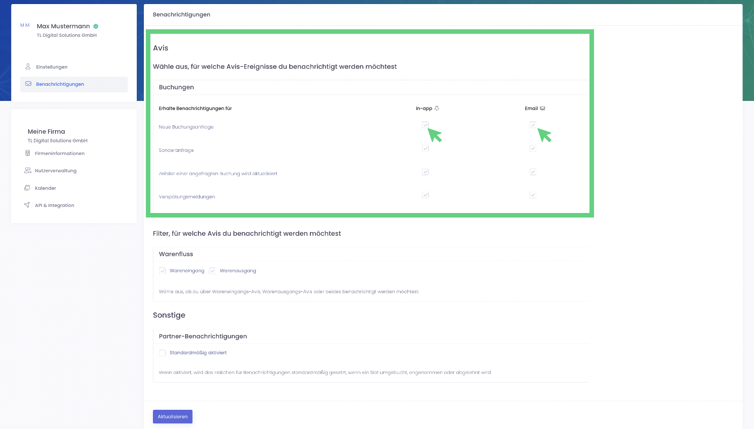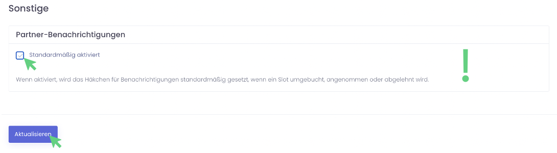 ❗Im letzten Schritt kannst du Einstellungen bezüglich der Partner-Benachrichtigungen vornehmen. Kreuze das Kästchen an, damit deine Partner immer über Buchungsbestätigungen oder -ablehnungen informiert werden!