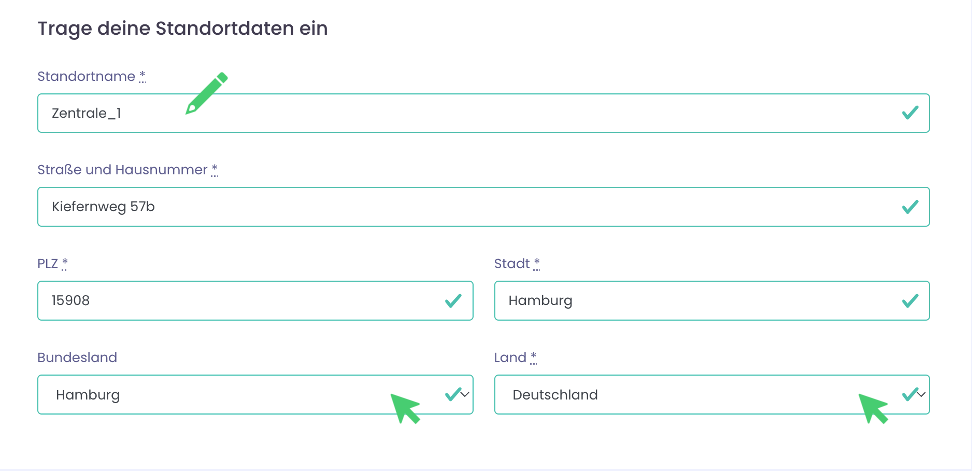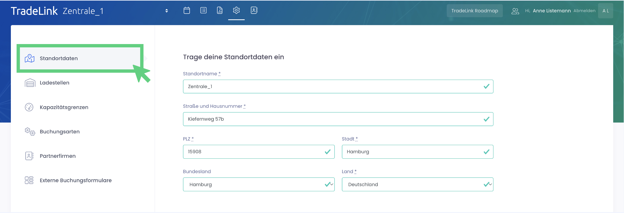 Bei den Standortdaten kannst du zunächst Name und Anschrift des Standortes anpassen. Die Bezeichnung des Standortes, hier als "Standortname" wird so auch deinen Partnerfirmen beim Avisieren angezeigt.