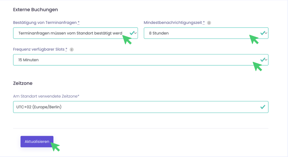 Weiterhin kannst du Einstellungen zu Externen Buchungen vornehmen, dazu gehören: