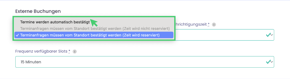 "Terminanfragen müssen vom Standort bestätigt werden": Hier gilt jede Buchung zunächst als Anfrage, die bereits im Kalender einen Slot reserviert. Die buchenden Partnerfirmen warten hierbei auf deine finale Bestätigung. Termine können hierbei auch direkt abgelehnt werden.