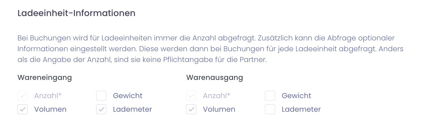 Unter 'Ladeeinheit-informationen' kann angegeben werden, welche zusätzlichen Informationen (z.B. Volumen) bei der Buchung für die jeweiligen Ladeeinheiten abgefragt werden sollen.