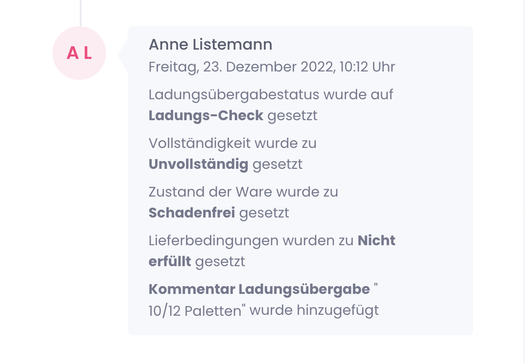 Mit dem Bearbeiten einer Buchung passt sich der dazugehörige Status an. Deinen Partnern wird angezeigt, ob eine Aktion von dir oder deinen Partnern benötigt wird, damit die Anlieferung beziehungsweise Abholung durchgeführt werden kann. Buchungen, die eine Aktion seitens deiner Partner benötigen, werden diesen farblich und gesondert angezeigt, damit diese nicht übersehen werden.