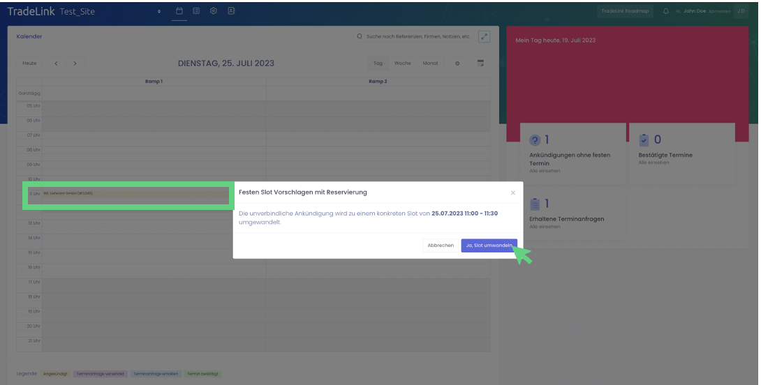 Sobald ein festes Zeitfenster für die hinterlegte Vorankündigung bekannt ist, kann es in einen konkreten Slot umgewandelt werden. Dies kann einfach per Drag&Drop oder durch Anpassen der Start- und Endzeit geschehen.
