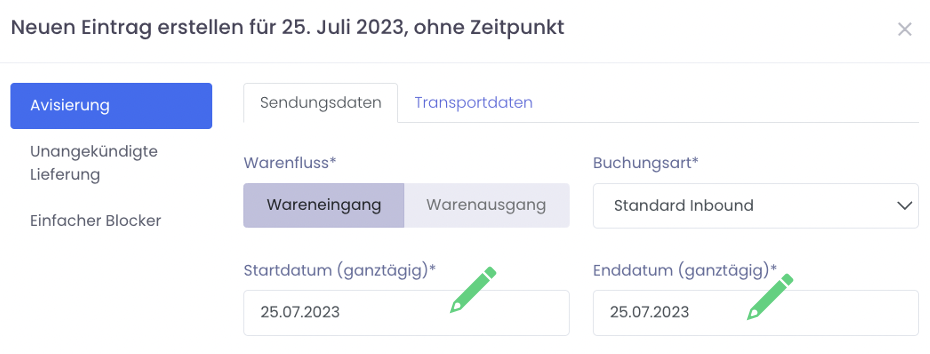 Vorankündigungen können erstellt werden, wenn noch kein festes Zeitfenster für den Transport bekannt ist. Diese können für einen Tag, mehrere Tage oder sogar eine/mehrere Wochen erstellt werden.