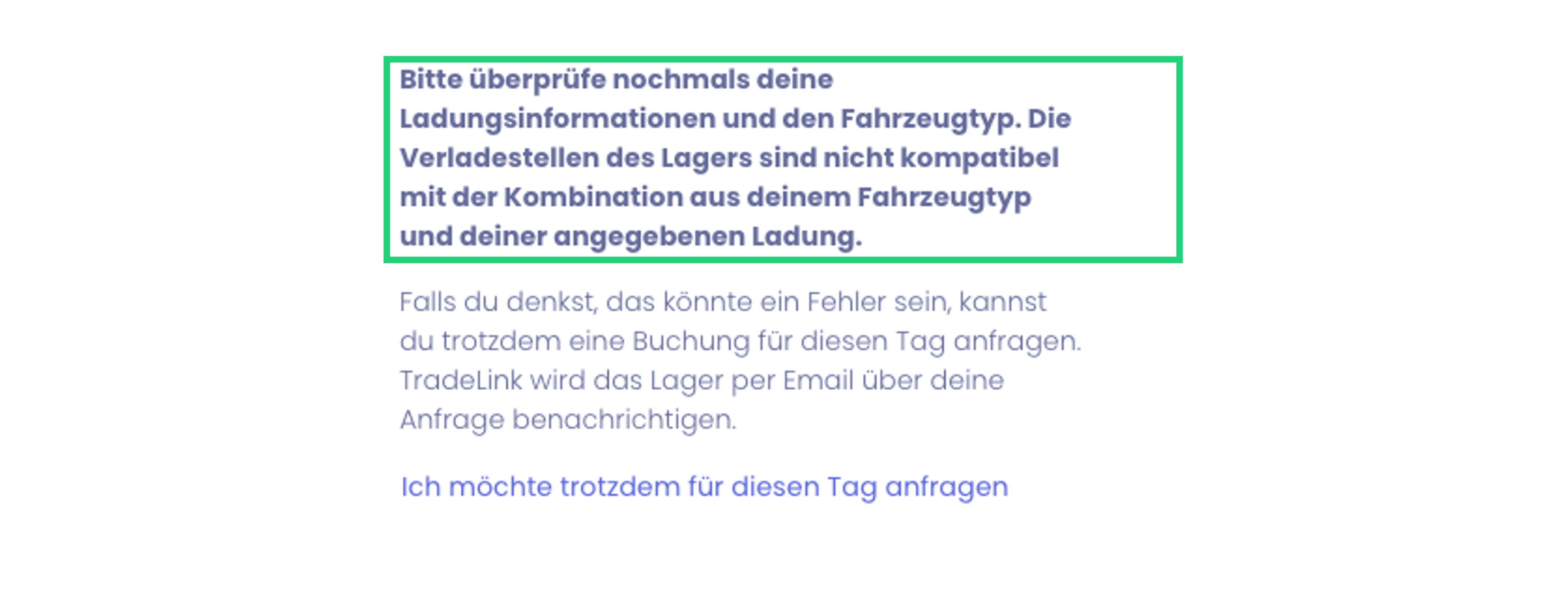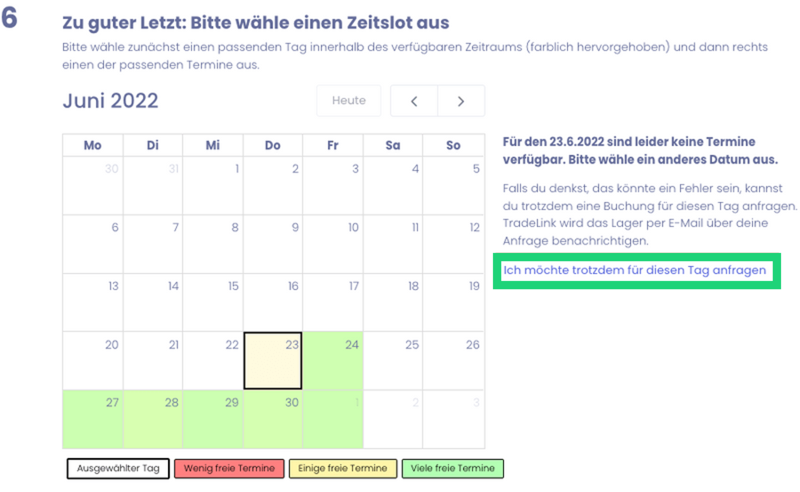 Alle Zeitfenster für den gewählten Tag sind bereits ausgebucht oder die Kapazität des Lagers ist überschritten. Wähle einen anderen Tag, um deinen Transport anzukündigen - Tage mit freien Zeitfenstern werden im Kalender grün/gelb angezeigt.