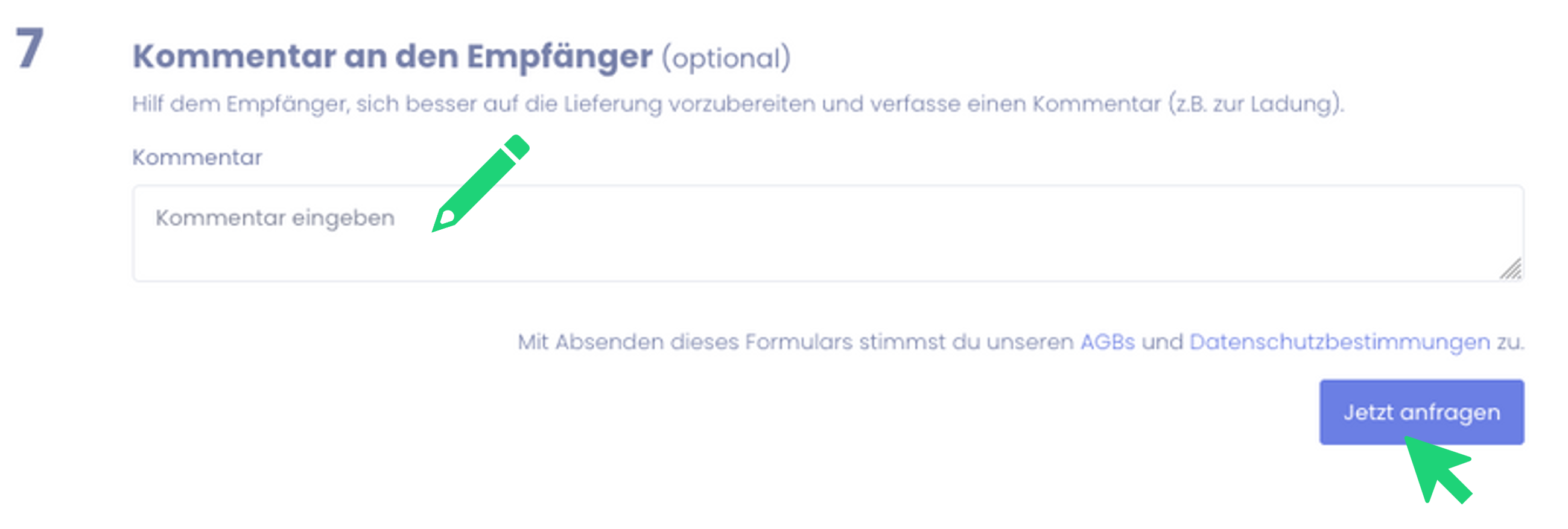 Mit der Sonderanfrage benachrichtigst du den Hof mit den Details deines Transports, wie der Anzahl der Ladeeinheiten, dem Fahrzeugtyp und dem gewünschten Datum.