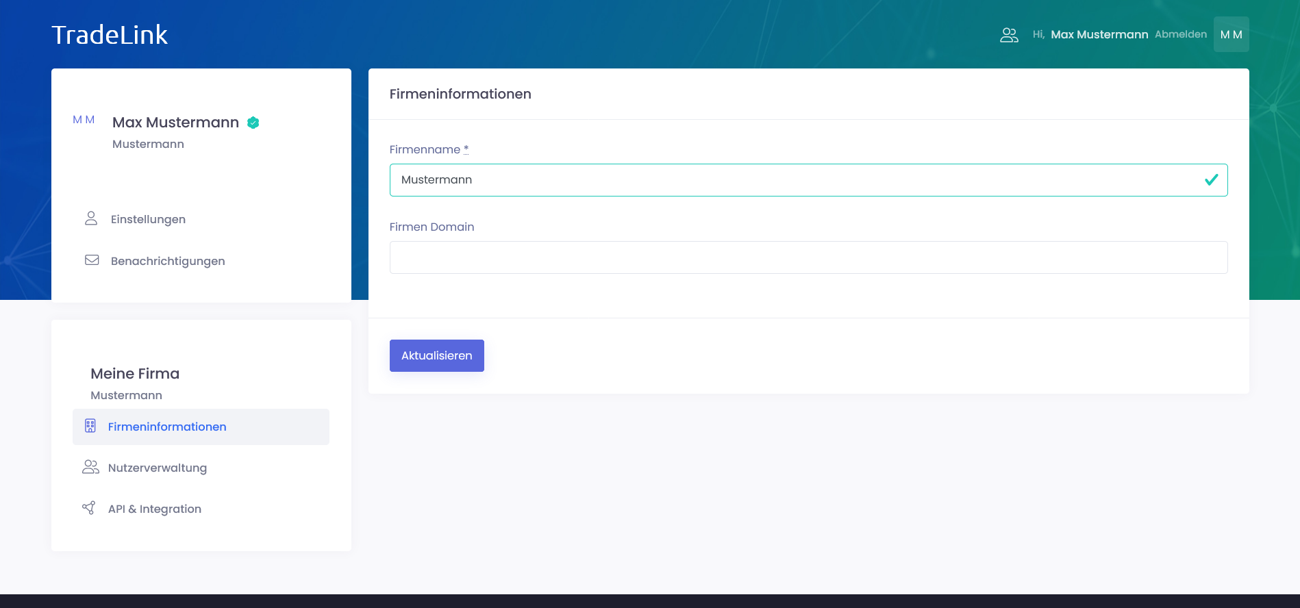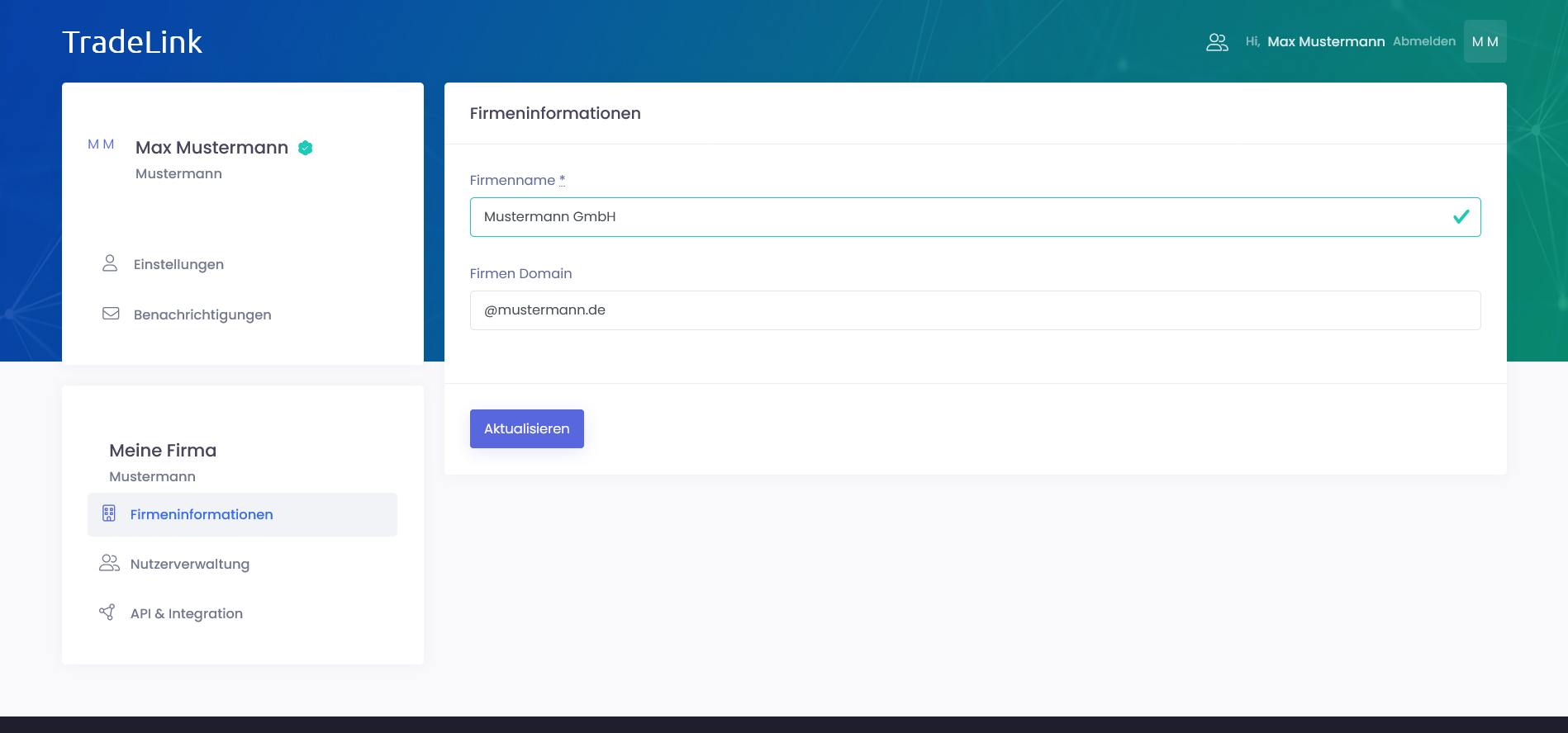 In der Rolle als "Firmen-Besitzer" kannst du dort nachträglich den Firmennamen verändern sowie die Firmen-Domain hinterlegen. Bestätigte deine Änderungen mit einem Klick auf ‘Aktualisieren’.