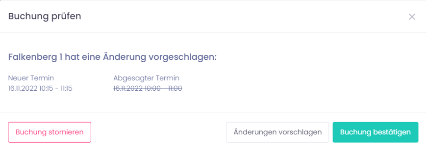 Mit einem Klick auf “Prüfen”, werden dir weitere Details zu der Änderung angezeigt. Du kannst diese bestätigen, ablehnen und damit die Buchung stornieren oder weitere Änderungen vorschlagen.