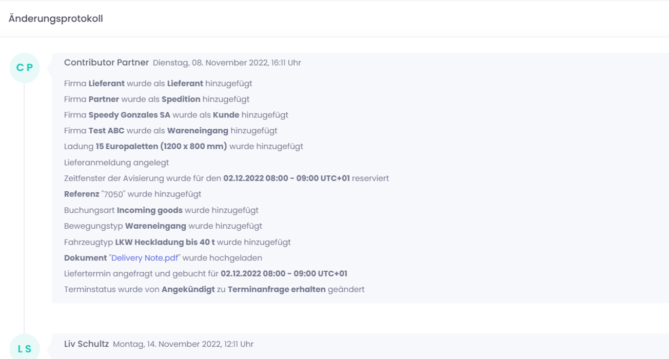 Unter der Detailanzeige der Buchung befindet sich das Änderungsprotokoll. Hier werden alle Fortschritte und Änderungen an der Buchung chronoglogisch für alle dem Transport zugeteilten Partner aufgelistet.