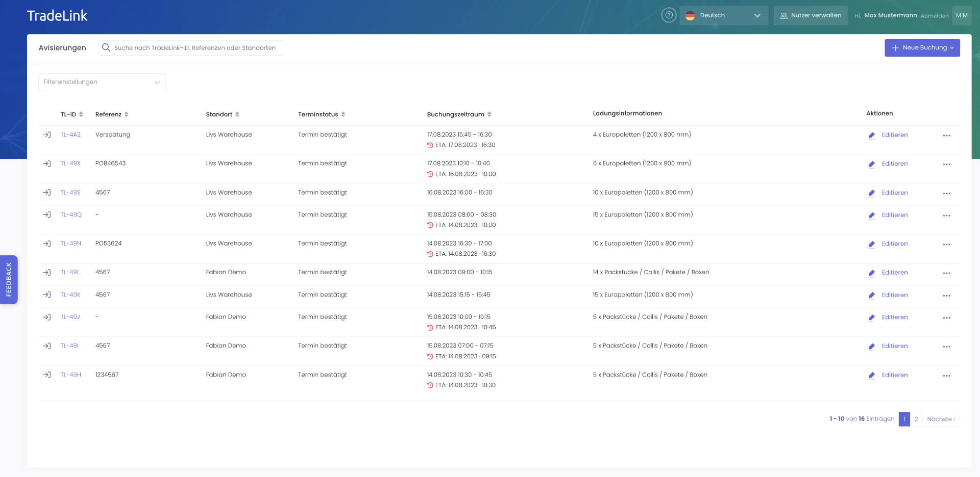 Um eine Verspätung zu melden musst du dich zunächst in dein TradeLink Konto einloggen. In der Listenansicht werden dir all deine Buchungen angezeigt.