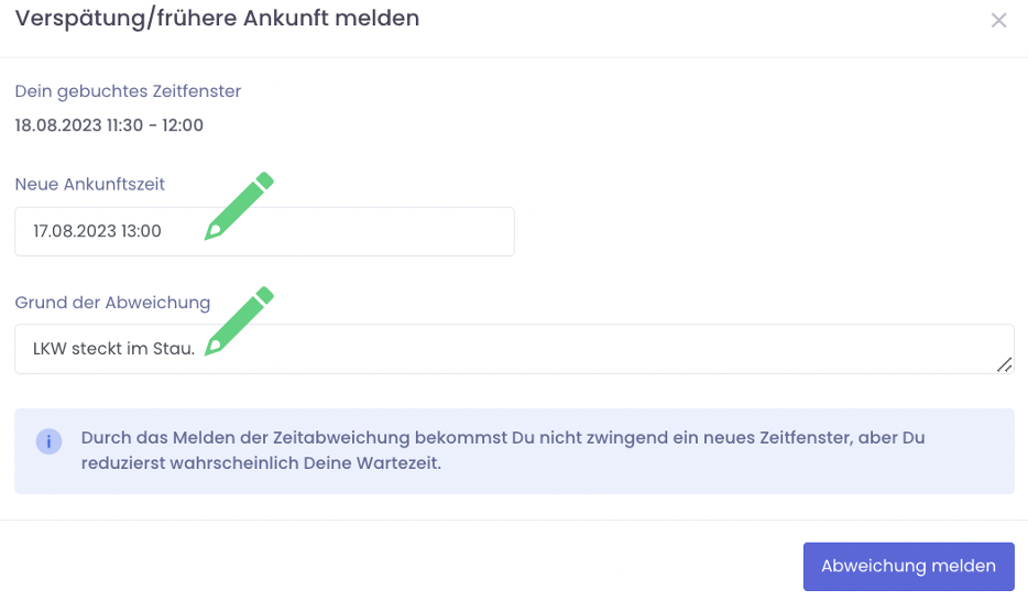 Du kannst hier die (neue) voraussichtliche Ankunftszeit eingeben und optional einen Kommentar und/oder einen Grund für die Abweichung hinterlassen. Deine Änderungen speicherst du mit einem Klick auf 'Abweichung melden'.