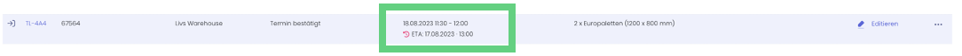 Sobald du deine Änderungen gespeichert hast, wird dir die neue Ankunftszeit (ETA) unter dem Status 'Buchungszeitraum' in deiner Listenübersicht angezeigt.