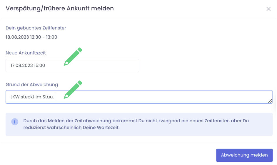 Klicke auf 'Verspätung melden' und geben eine (neue) voraussichtliche Ankunftszeit an. Optional kannst du deinem Kunden auch einen Kommentar und/oder einen Grund für die Abweichung hinterlassen.