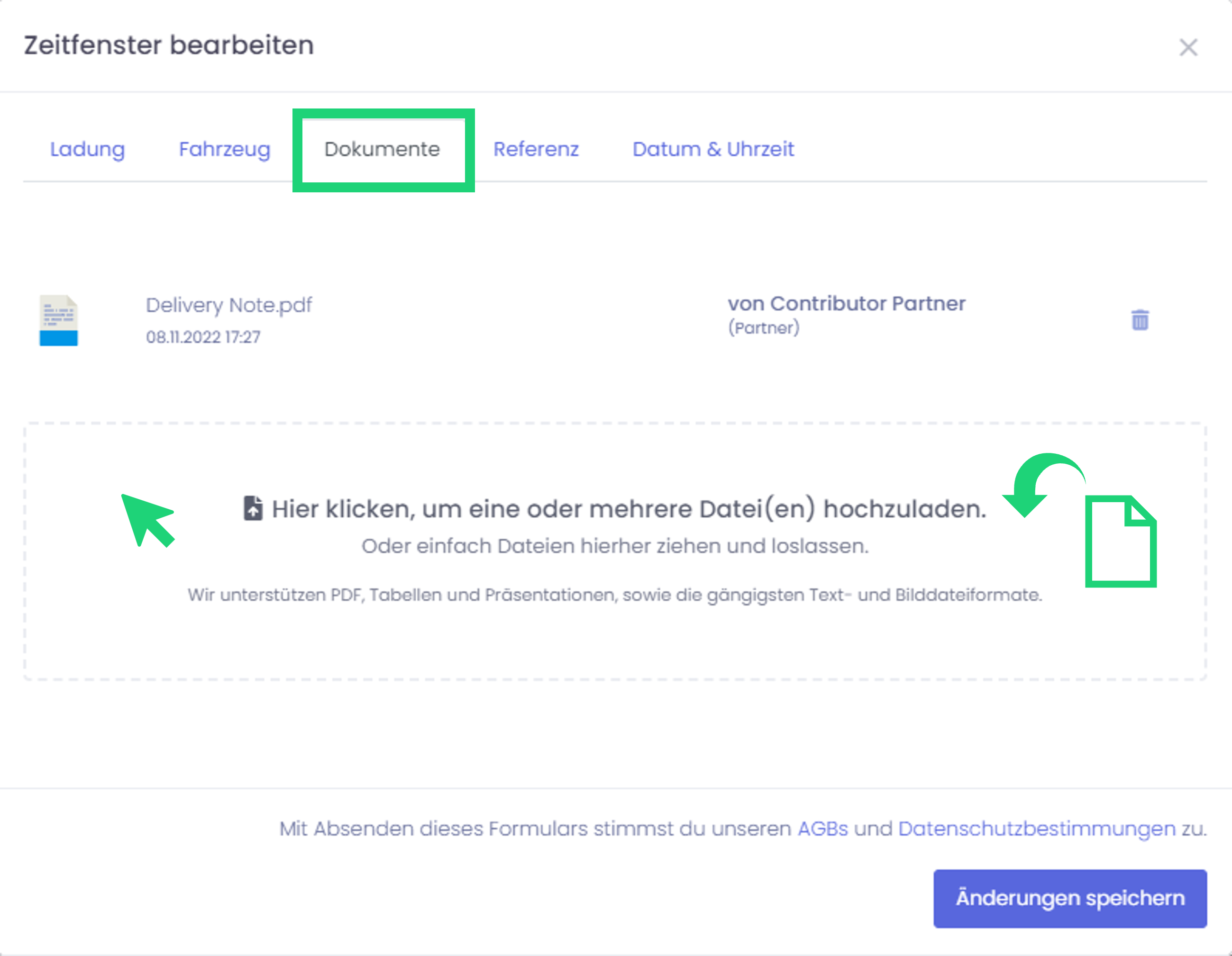 Unter dem Reiter “Dokumente” hast du dann die Möglichkeit deiner Buchung Dokumente hinzuzufügen. Ziehe entweder deine Dokumente per Drag and Drop in das Feld oder klicke auf das Eingabefeld, um das gewünschte Dokument auszuwählen.