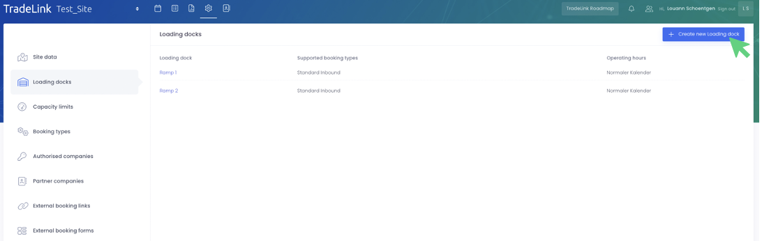 Loading points can be created under the site settings. In your site settings, navigate to "Loading docks" and click on "+ Create new loading dock".