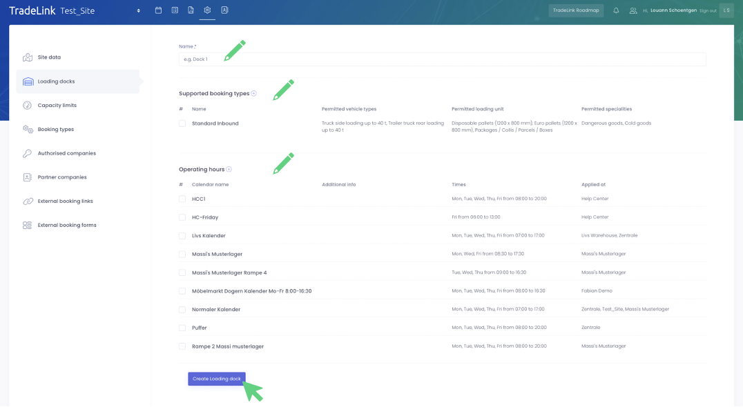 The article "Creating booking types" provides you with a detailed explanation on how you can map different booking types on TradeLink. These booking types must then be assigned to so called loading docks.