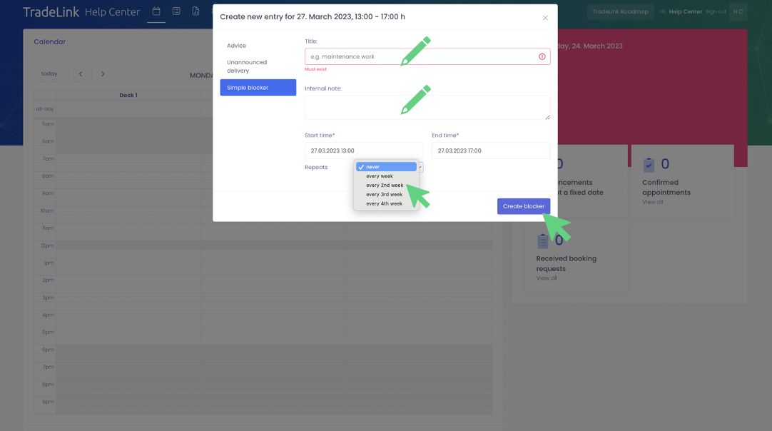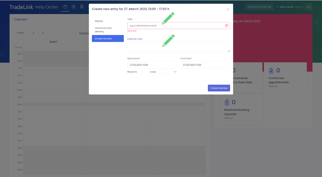 Click on the desired start time for your blocker in the calendar or select the time slot via drag and drop. A new window will open.