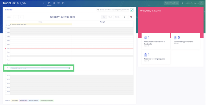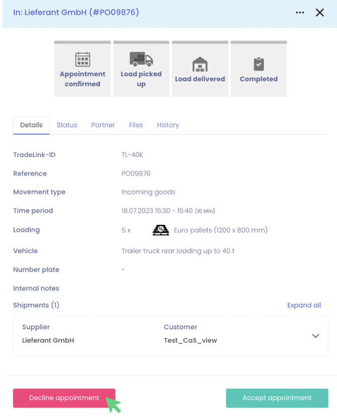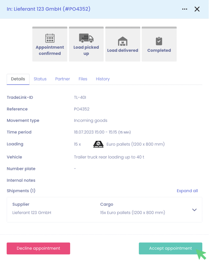 To accept the booking, you must first click on the advice. A summary of the data of this booking will open on the right side of your screen. If all the necessary information has been filled in by the partner and the details of the transport are correct, the booking can be accepted by clicking on "Accept appointment".