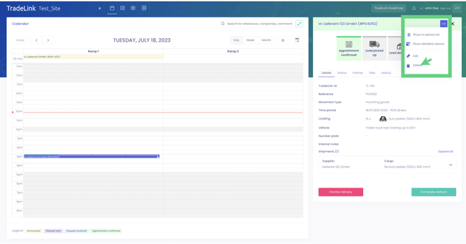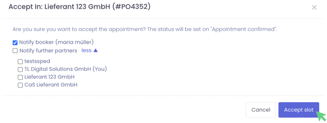 When you accept the appointment, you can also choose whether only the person who made the booking or other parties involved in this transport should be informed about it as well.