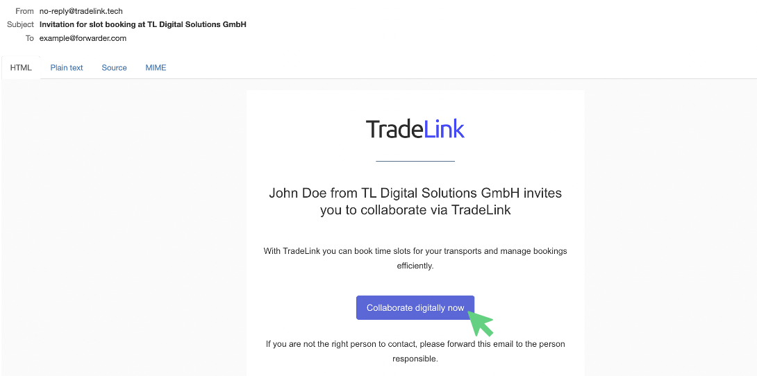 The essential requirement for a one-time booking via a booking link is an invitation from your organization as a partner company. This e-mail, "Invitation to slot booking," may have been sent directly to you or one of your colleagues.