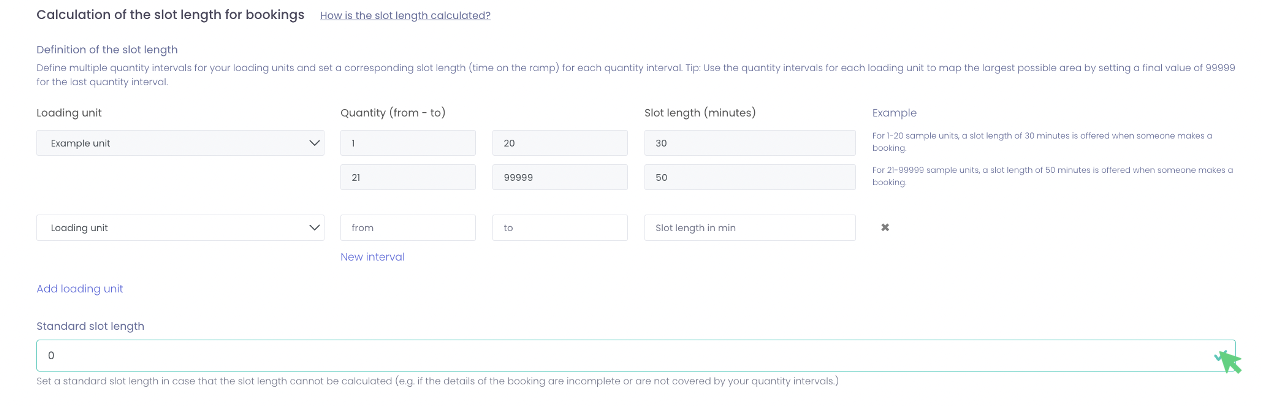 You must also specify a default slot length in case the slot length cannot be calculated (for example, if the booking data is incomplete or not covered by your quantity intervals).