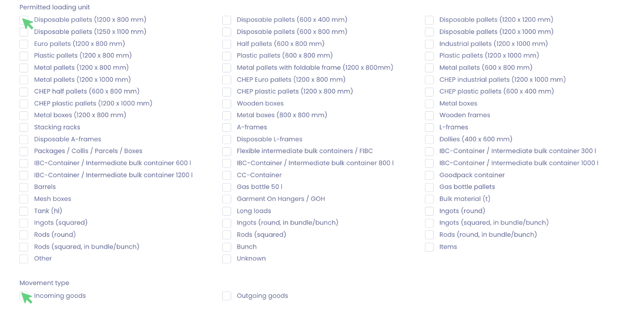 If specialities are allowed (e.g. empties, dangerous goods,...) this can be marked by ticking the corresponding fields.