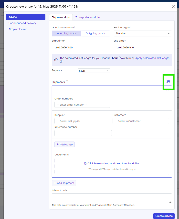 This feature was developed for warehouse operators, is located in the modal for creating a new advice, and enables even faster addition of multiple shipments with the same delivery information in one go.