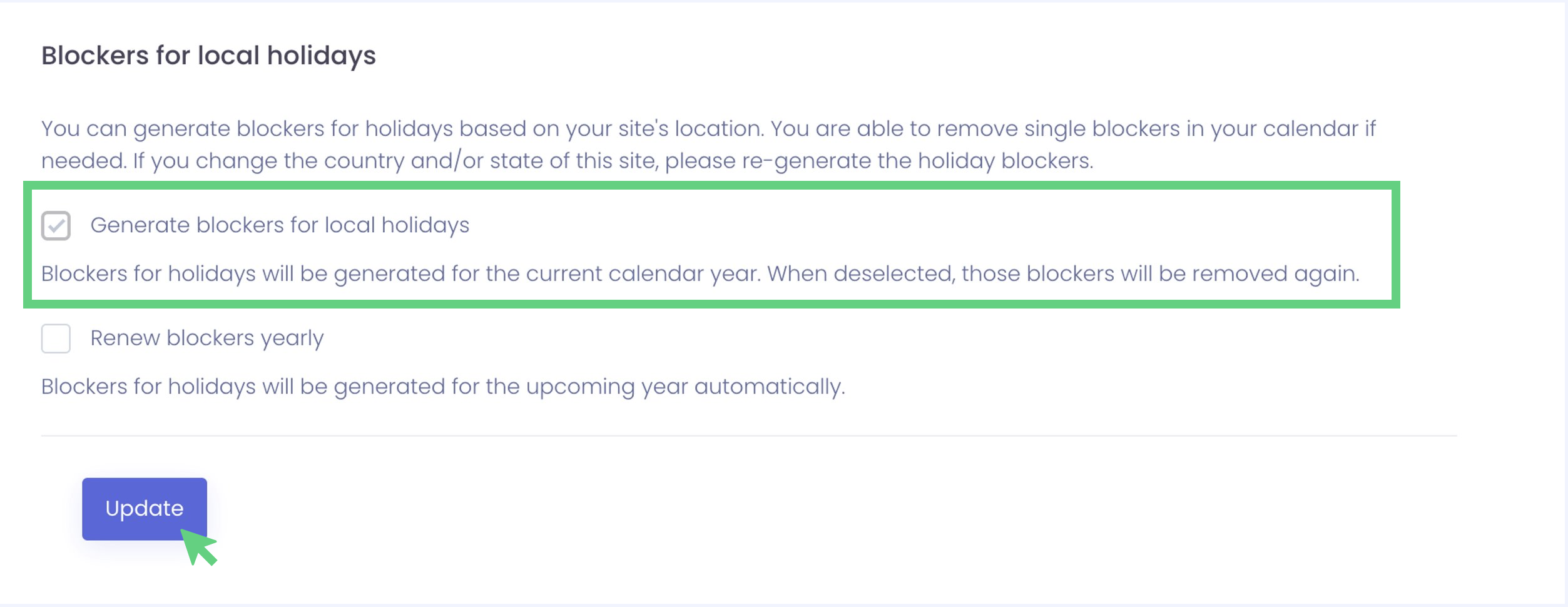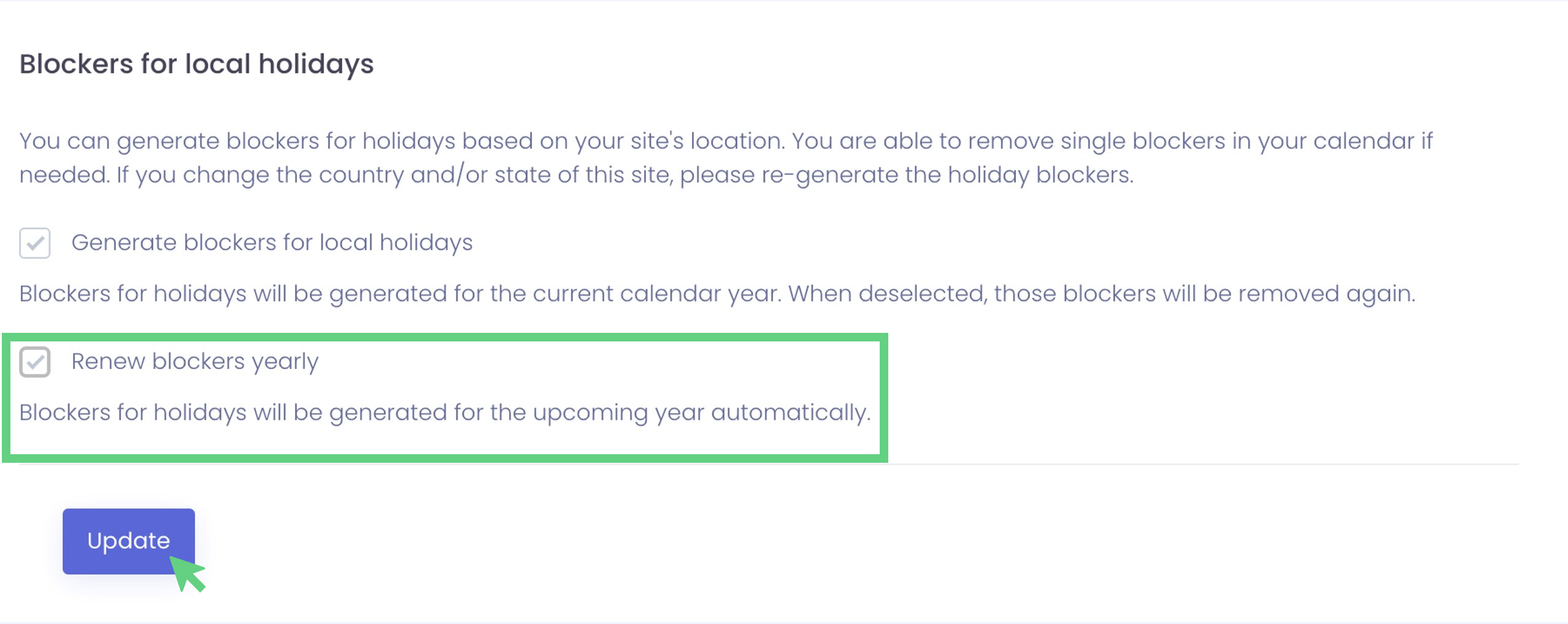 The second option "Renew blockers yearly" ensures that blockers for bank holidays are automatically created every year.